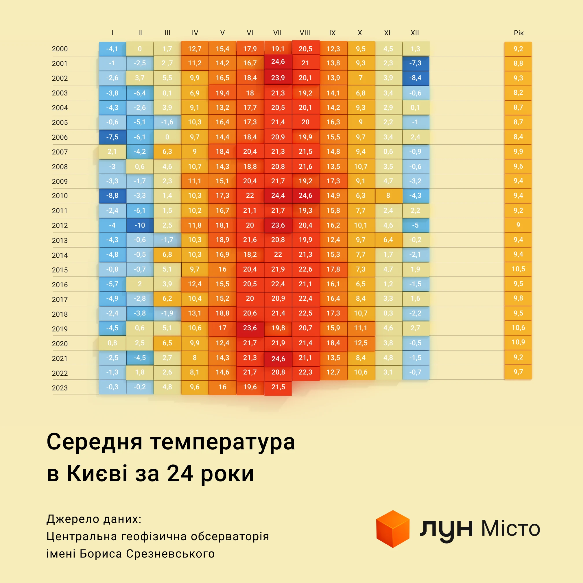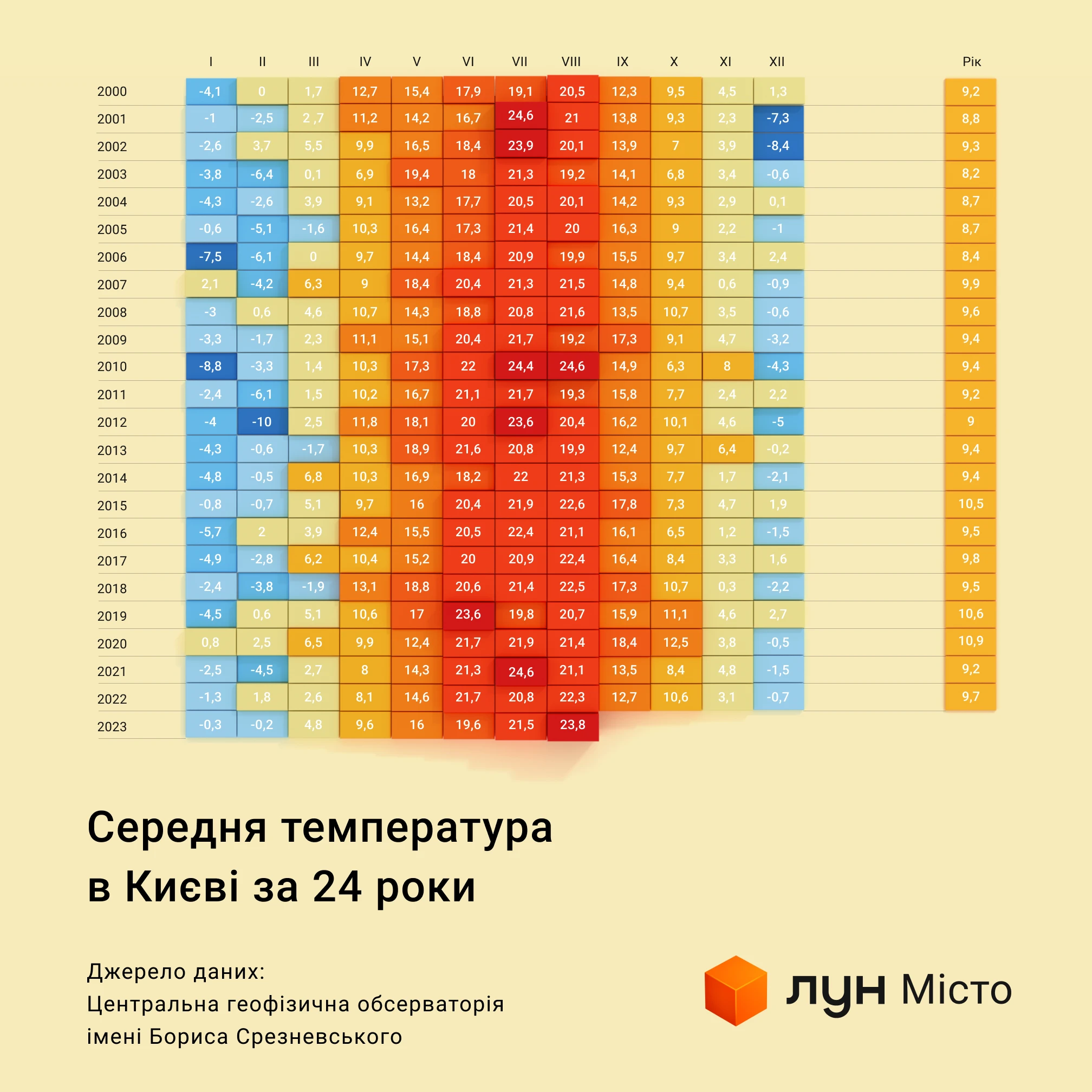 Як в цілому змінюється температура у Києві з роками? Щоб дізнатися, проєкт міських досліджень ЛУН Місто запитав та візуалізував дані за 24 роки від ЦГО.