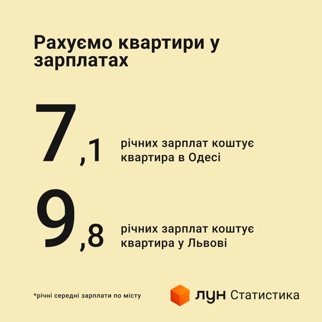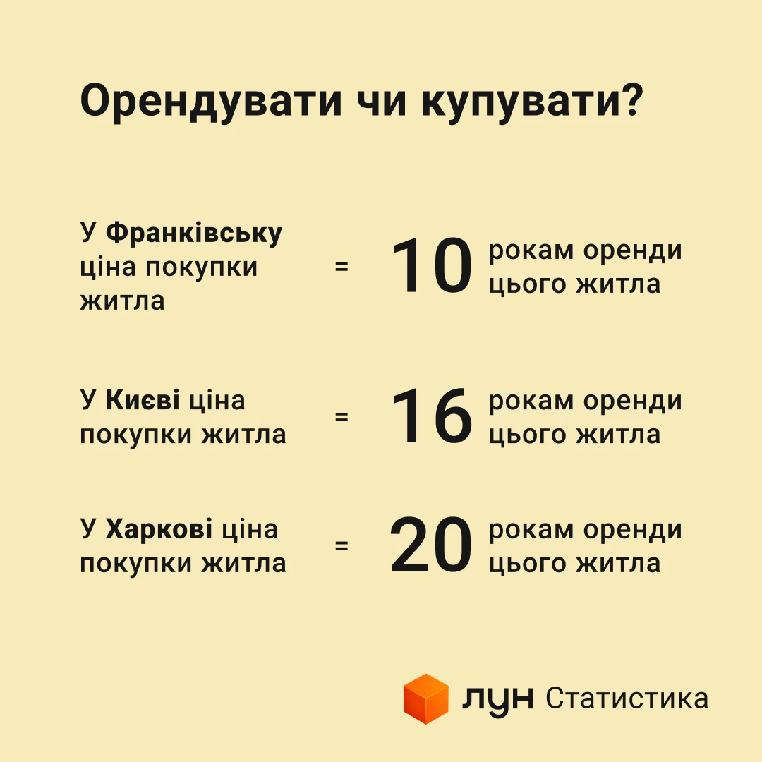 Для аналізу економічної доцільності придбання житла, розраховують співвідношення річної плати за оренду до вартості квартири. Так, наприклад, без урахування амортизації та супутніх витрат, у Києві середня вартість квартири еквівалентна 15 рокам її оренди. У Львові цей показник — 11 років, в Одесі — 17. Харків демонструє майже 20 років оренди, що в першу чергу повʼязано з падінням цін на довгострокову оренду в прифронтовому регіоні.