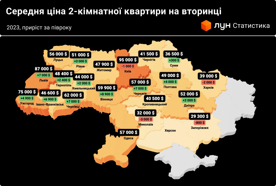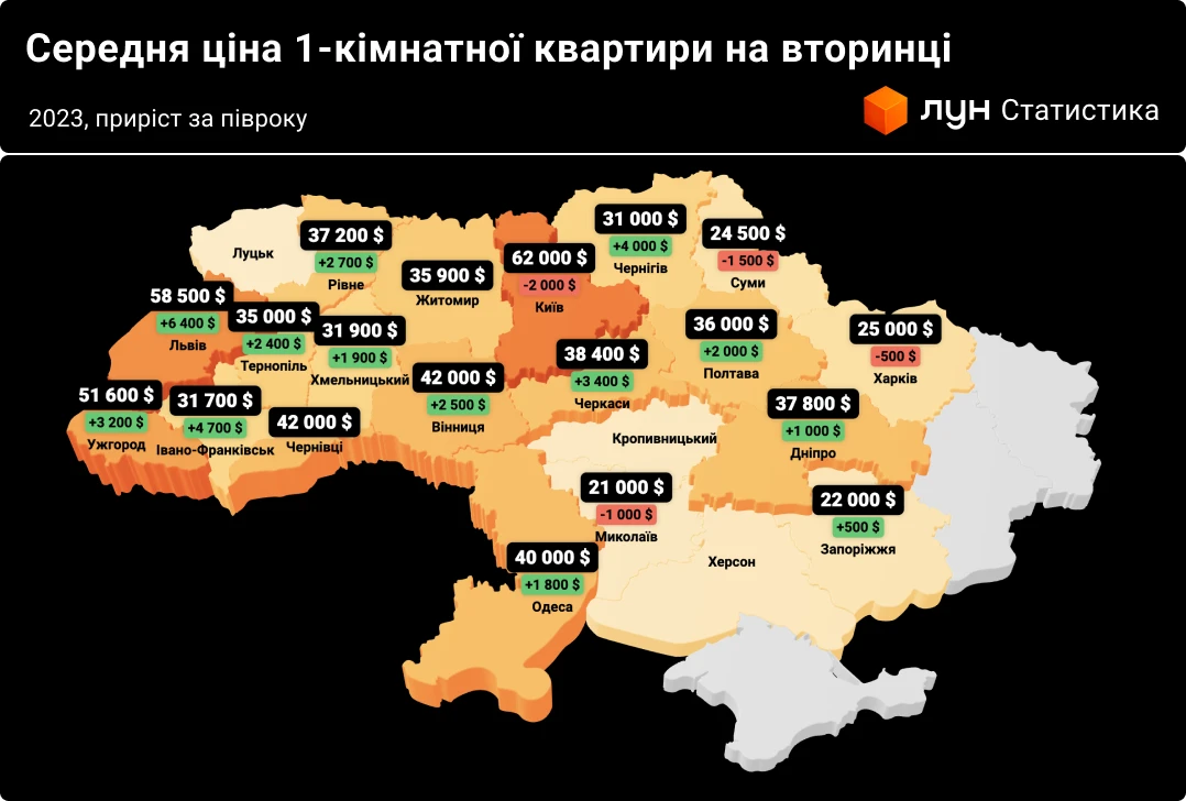 В абсолютних числах серед найбільш популярного варіанту серед українців, – 1-кімнатних квартир, найбільше втратила столиця, де в середньому квартири здешевшали на 2000 доларів, а найбільше набрав Львів — +6400 доларів, Івано-Франківськ — +4700 доларів. Чернігів — +4000 доларів обігнав навіть Ужгород +3200 доларів.