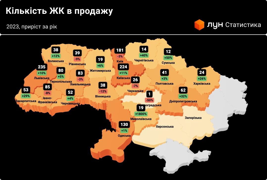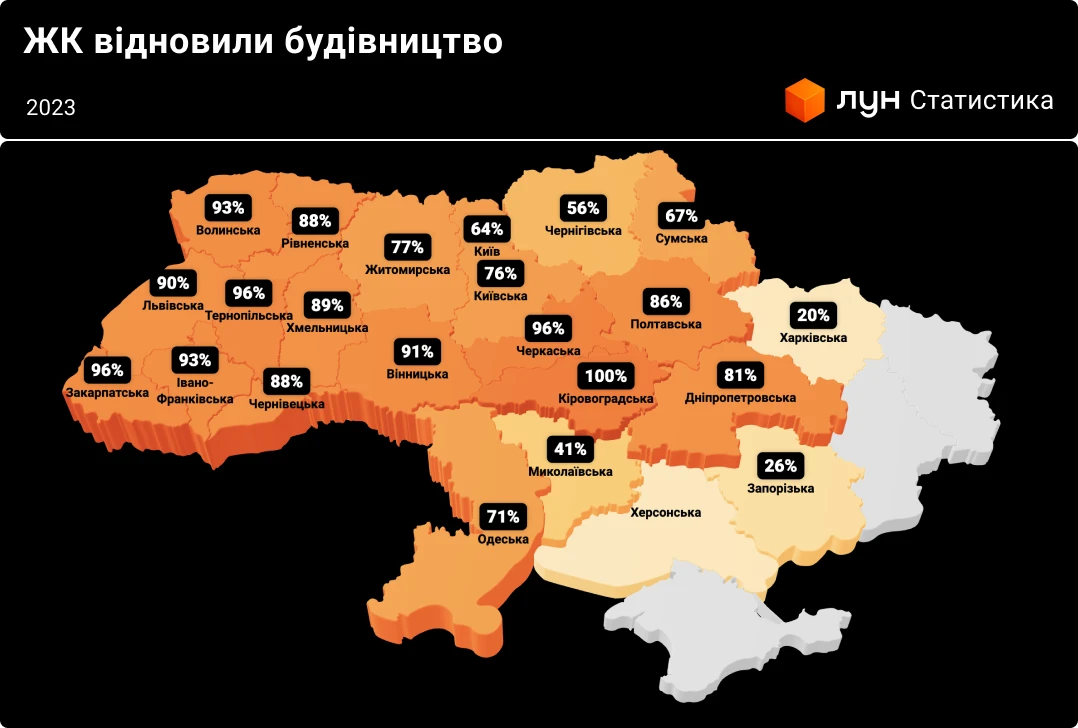 Кількість виставлених на продаж житлових комплексів на первинці напряму повʼязана з віддаленістю від фронту. Так найбезпечніші західні регіони мають 80-90 і більше відсотків відкритих відділів продажу відносно рівня до вторгнення.