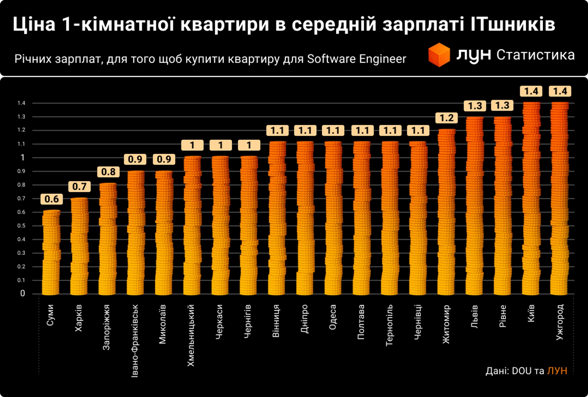 Ілюстративний розрахунок необхідної кількості річних зарплат програмістів, щоб придбати житло у своєму місті.