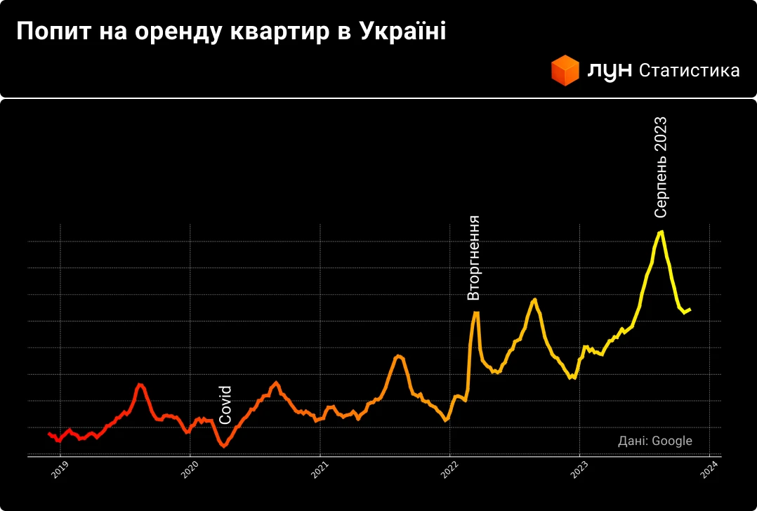 Попит на оренду продовжує зростати, що підкреслює міграційні процеси в Україні. Так серпень 2023 був рекордним щодо інтересу оренди квартир за всю історію спостережень.