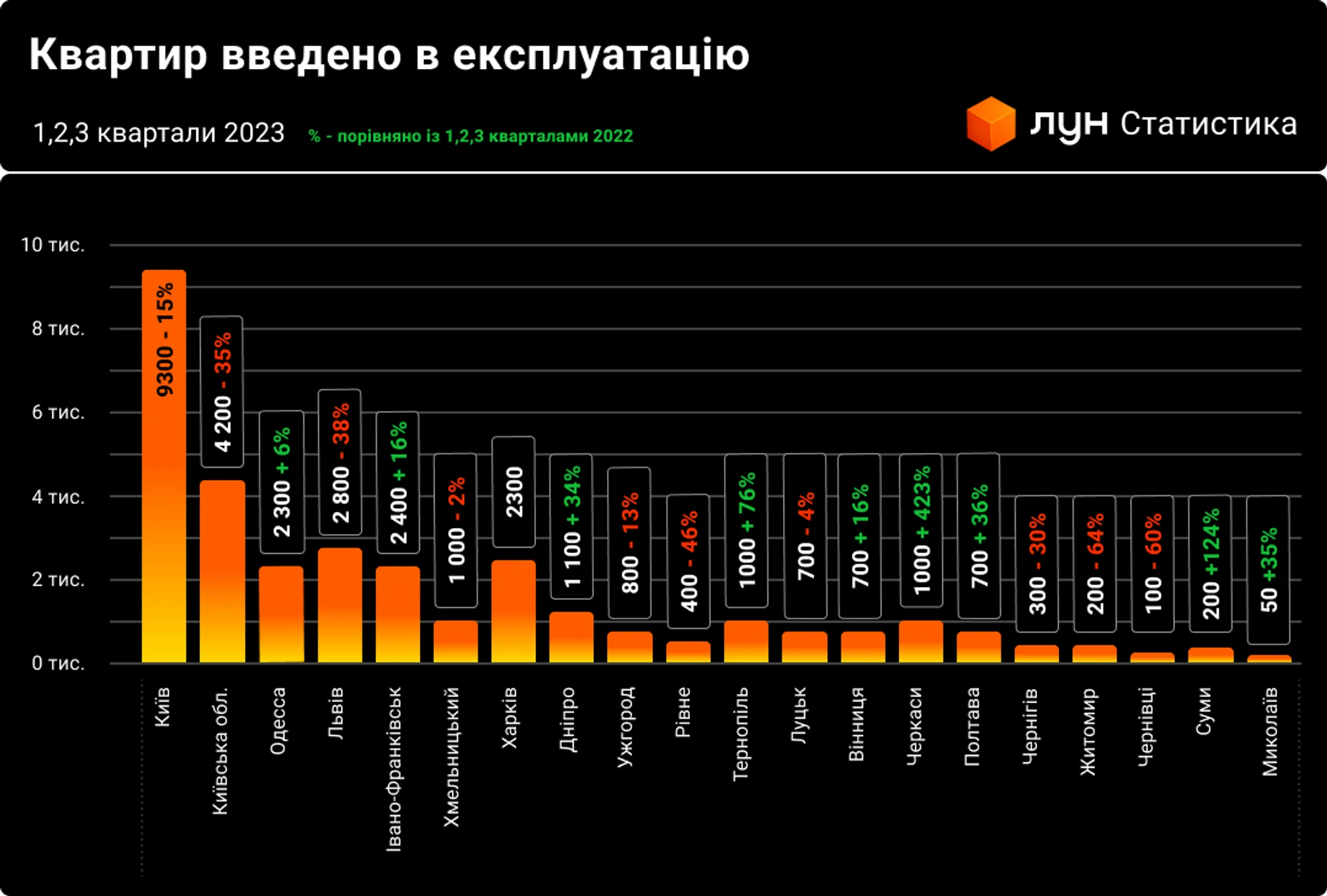 Київ втратив 15% у обʼємах введеного в експлуатацію житла відносно перших трьох кварталів 2022 року. Київська область втратила аж 35%. Львів втратив 38%, а Одеса здала на 6% більше. Дніпро також підріс в статистиці і додав 34%.
