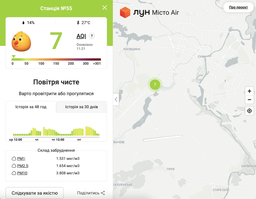 Слідкуйте за даними у реальному часі на нашій карті https://misto.lun.ua/air/55 та на сервісах партнерів.