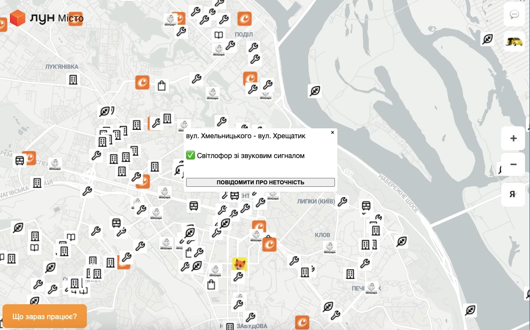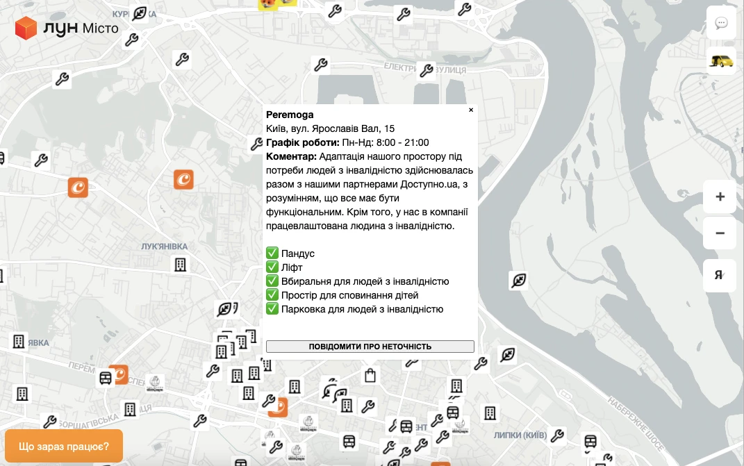 Карта є інтерактивною і постійно оновлюється, тож якщо користувач помічає на карті неточність — може повідомити про це натиснувши на картці локації кнопку “Повідомити про неточність”
