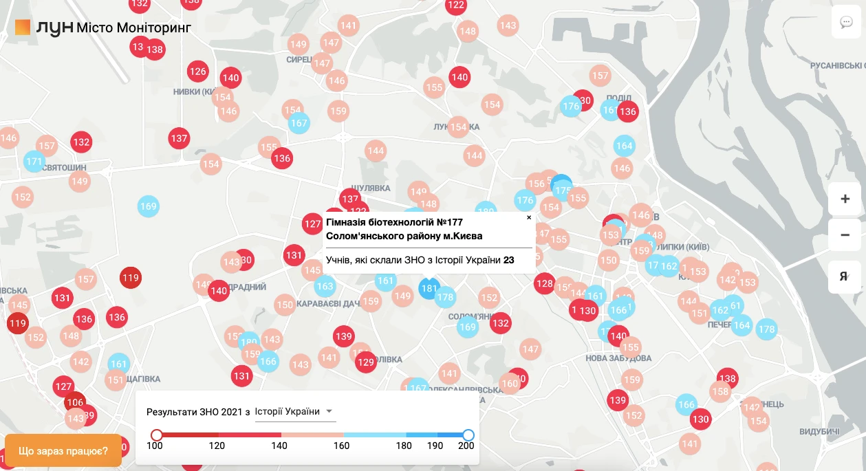 Команда ЛУН Місто робить інтерактивні карти з результатами ЗНО вже третій рік поспіль. У минулі роки - це були дані тільки для Києва, цього разу ми розширили географію на всю Україну, крім тимчасово окупованих територій, по яких немає даних.