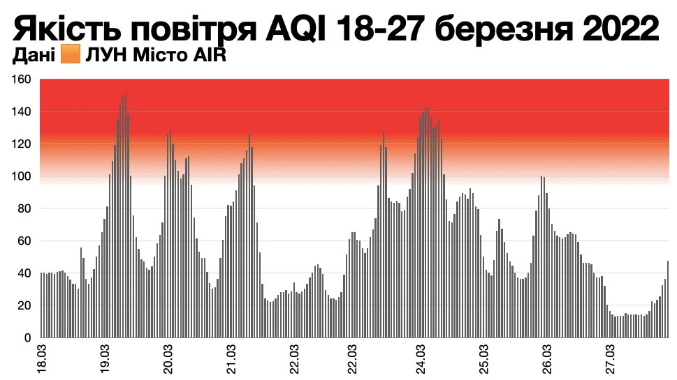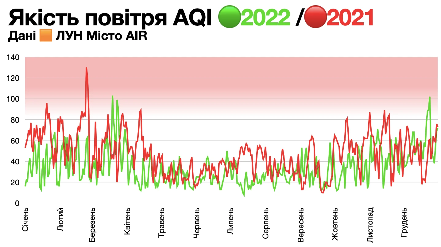 Водночас у березні 2022 та грудні 2022 станції ЛУН Місто AIR фіксували значні перевищення - показники сягали червоного рівня Повітря нездорове. У березні найбільш вірогідна причина перевищень - активні бойові дії біля Києва, спричинені нападом росії. У грудні - погодні умови, інтенсивне опалення, використання генераторів через блекаути спричинені обстрілами росією.