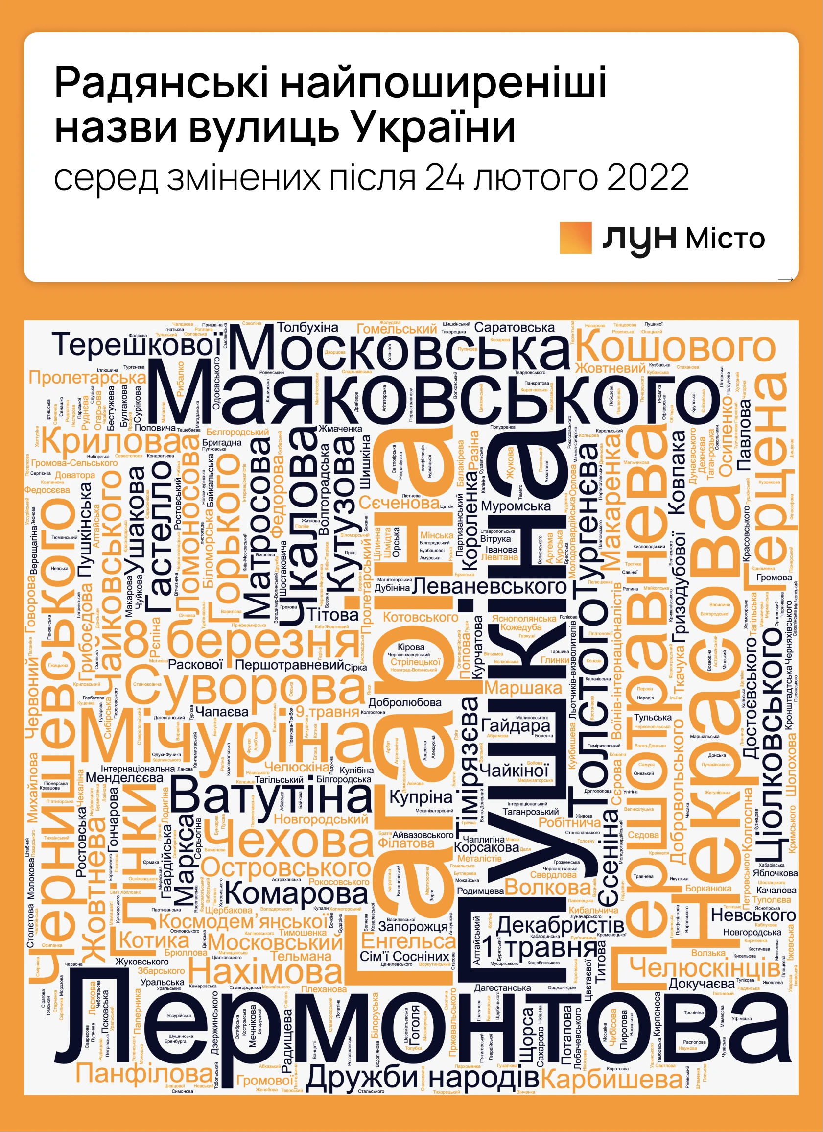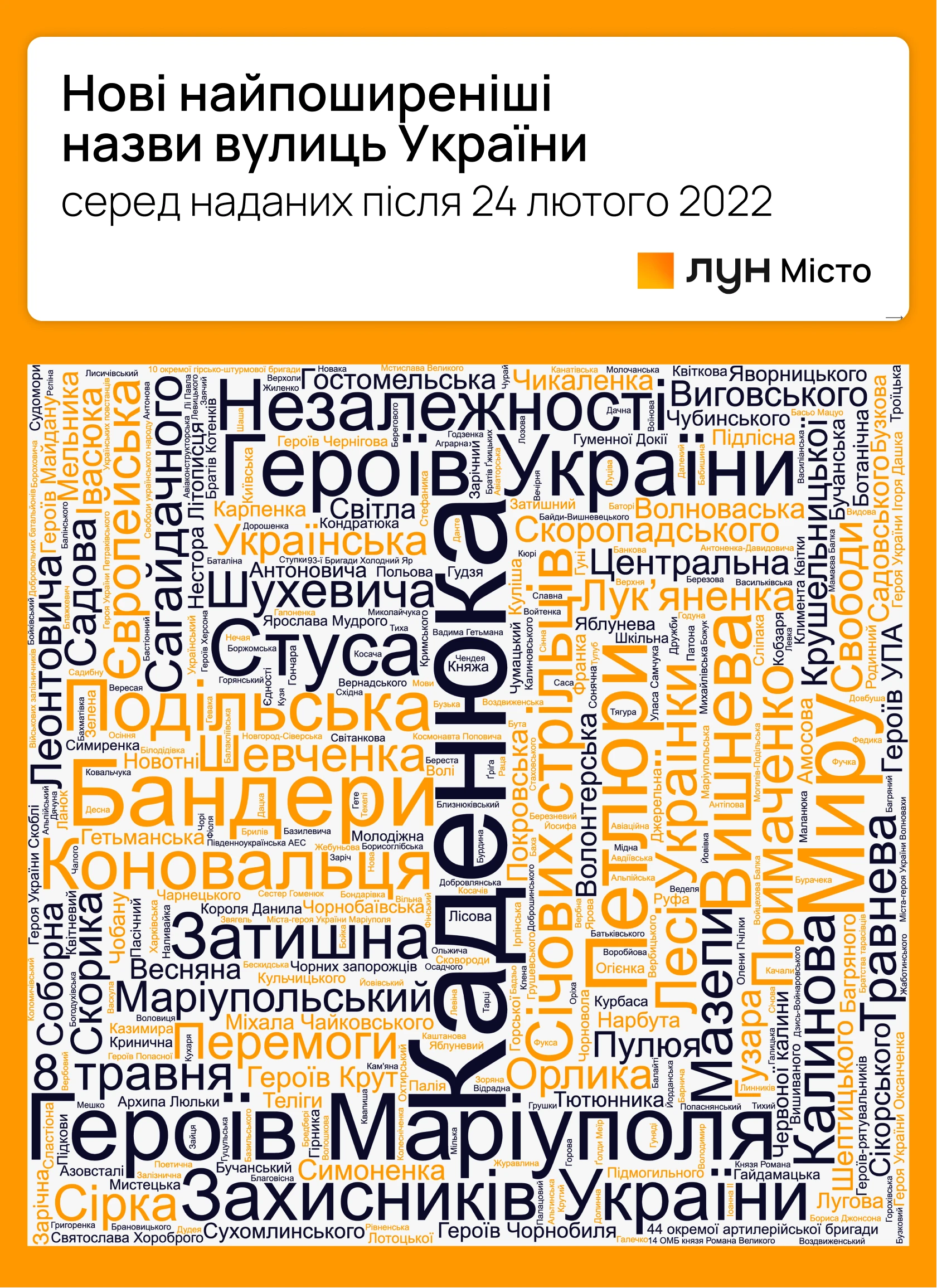 Героїв Маріуполя, Миру, Бандери, Героїв України, Петлюри, Стуса — це назви, які після 24 лютого 2022 часто дають вулицям, провулкам, проспектам України. Найчастіше ж вулиці сьогодні називають на честь українського астронавта Леоніда Каденюка. Його імʼя присвоюють при перейменуванні вулиць радянського космонавта Гагаріна.