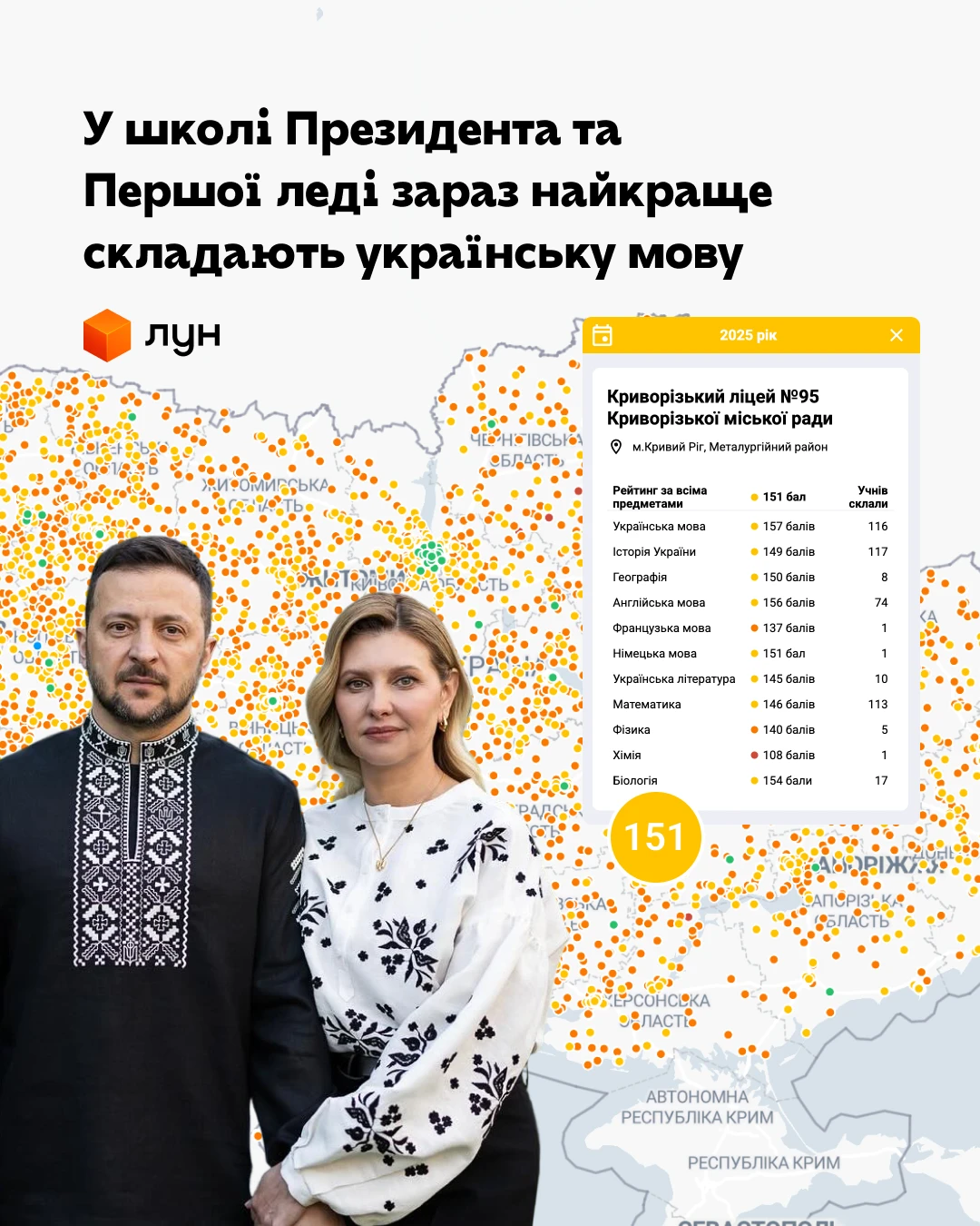 Для прикладу, у Криворізькому ліцеї №95, де навчався Володимир Зеленський, середній бал у 2025 році становить 151, українську мову склали 116 учнів із результатом 157. А у Львівській лінгвістичній гімназії Святослава Вакарчука середній бал 157, з англійської 92 учні отримали 161.