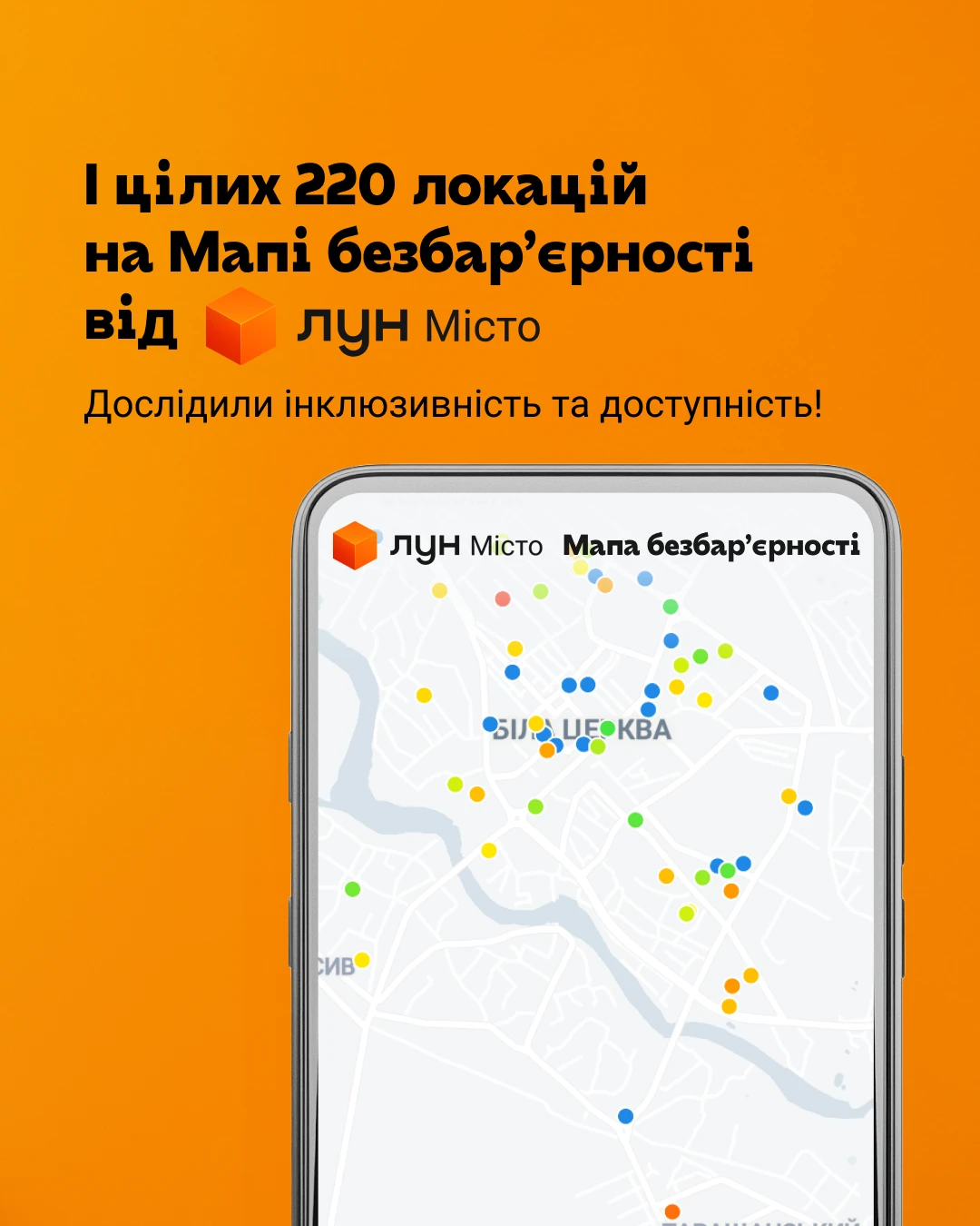 На Мапі безбар'єрності ЛУН з'явилася Біла Церква. Відтепер мешканці міста мають можливість оцінити рівень доступності міських просторів завдяки інтерактивній мапі від ЛУН. Проєкт створений безоплатно у співпраці з Білоцерківською міською радою. Дані зібрані за допомогою чеклистів, розроблених ГО ЛУН Місто та ГО «Безбар'єрність».