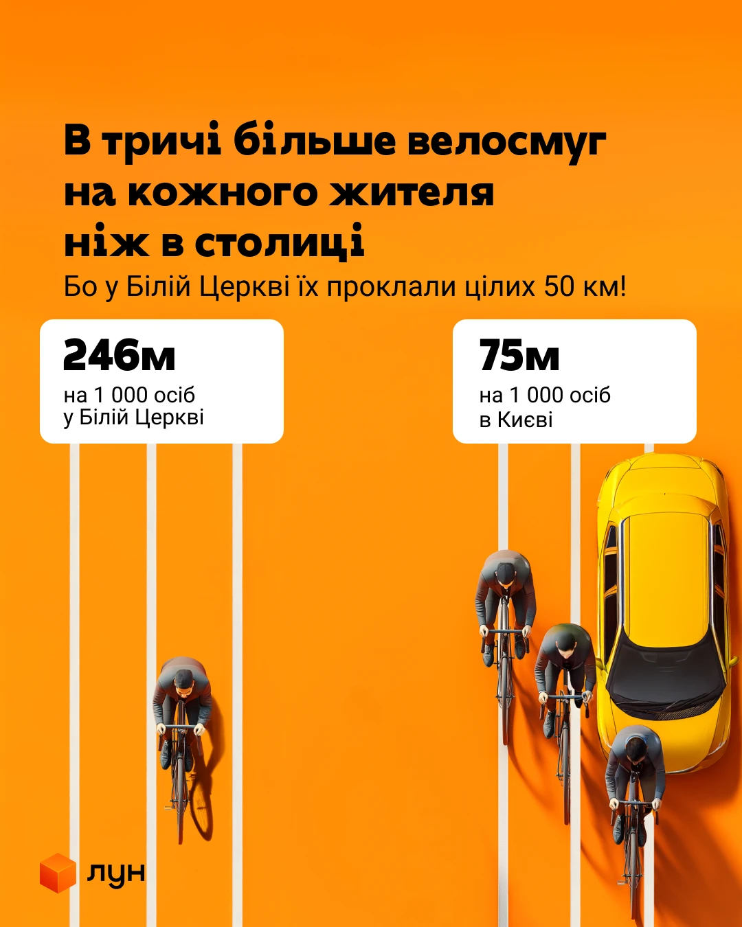 За оцінками ЛУН, Біла Церква має в три рази більше велосмуг на кожного жителя, ніж у столиці: 50 км велосипедних доріжок, або 246 метрів на 1 000 осіб, у порівнянні з 75 метрами на 1 000 осіб у Києві.