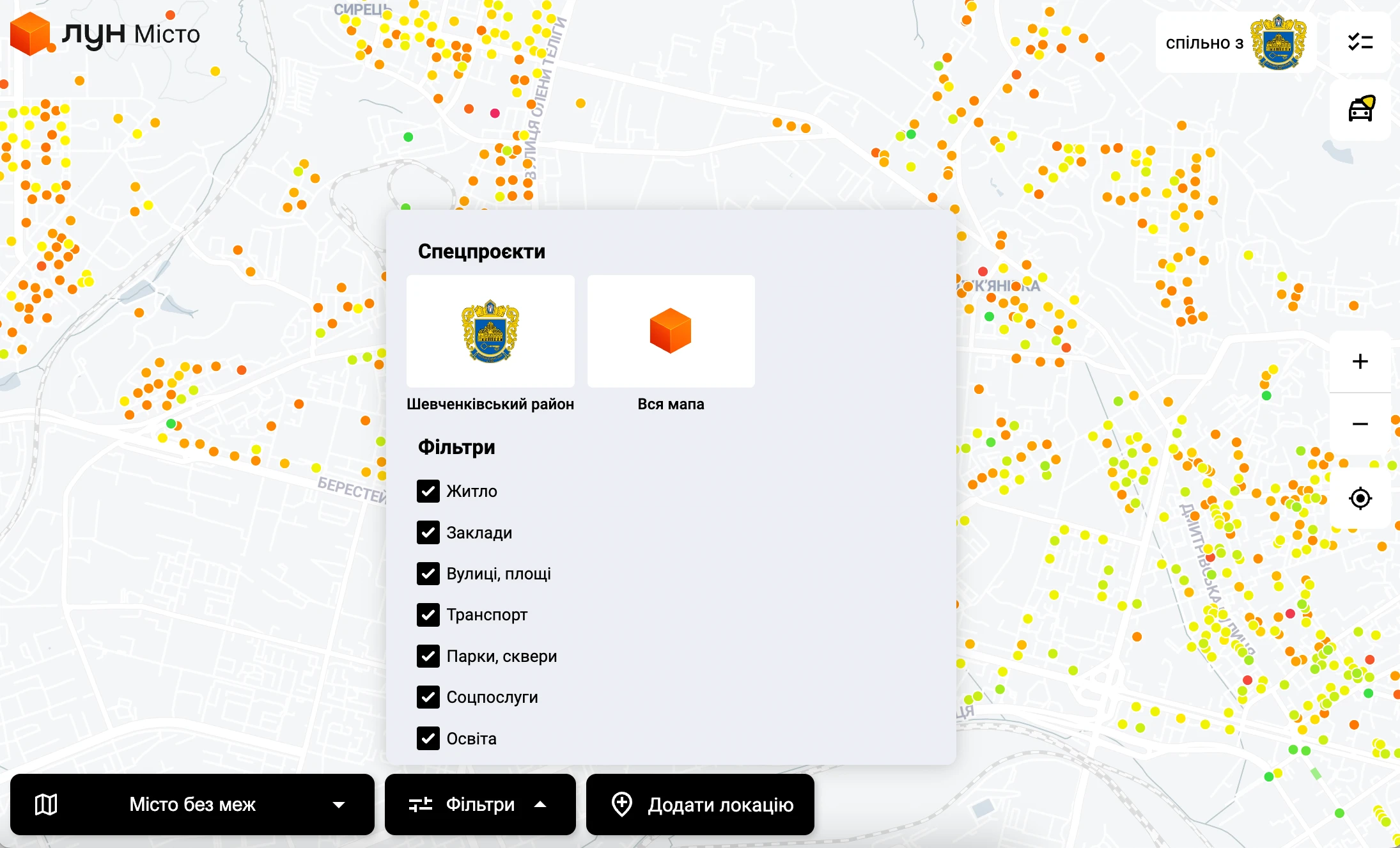 “Мапа Місто без меж: Шевченківський район” є частиною загальноукраїнської Мапи Місто без меж від ЛУН Місто, з новим розширеним функціоналом та можливостями.