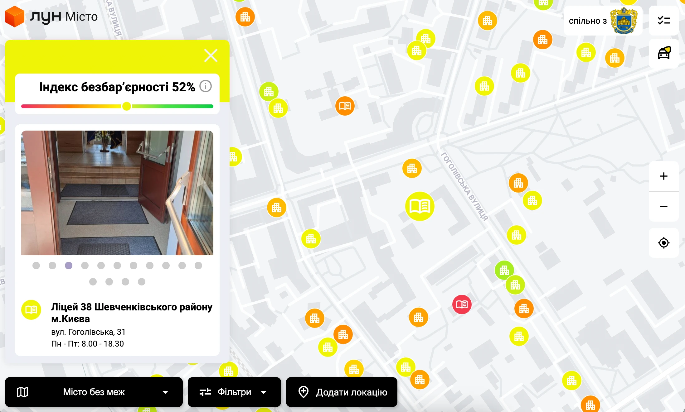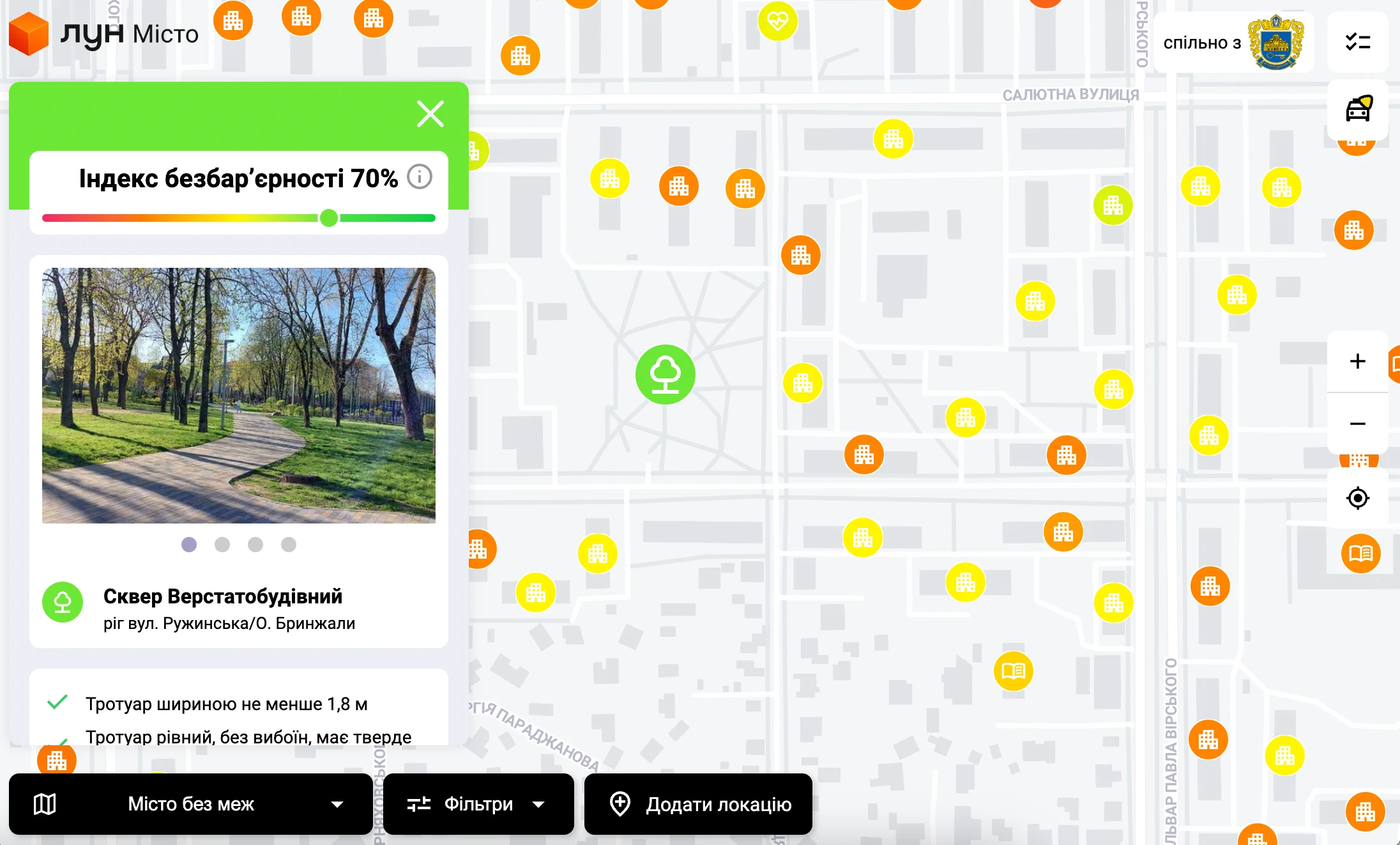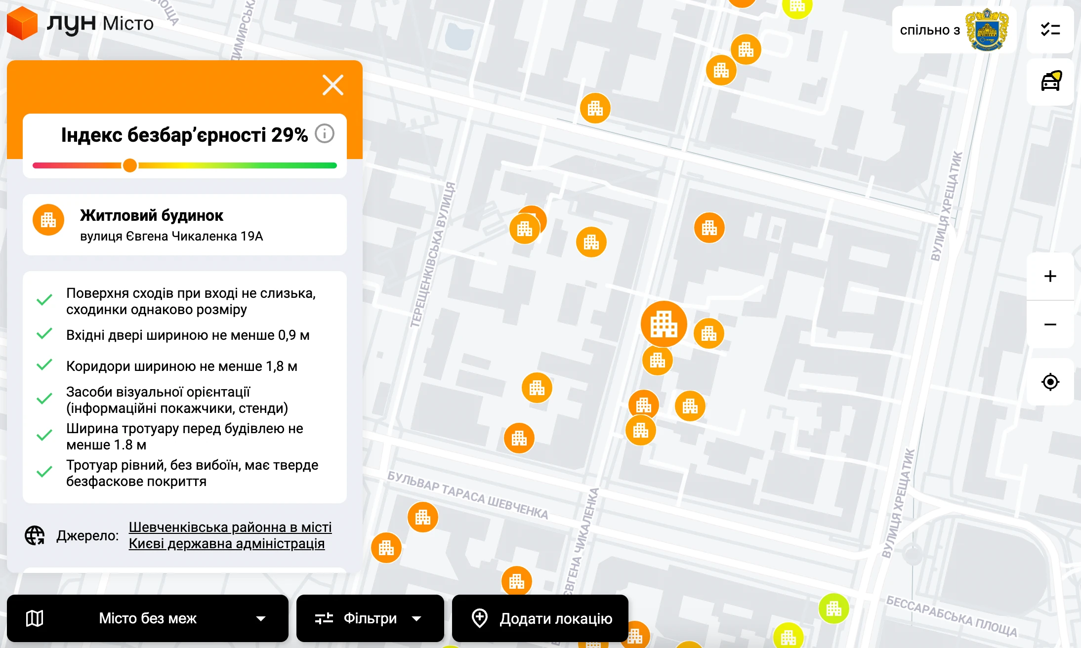 Так, Шевченківська районна в місті Києві державна адміністрація та ГО ЛУН Місто спільно створили “Мапу безбарʼєрності Місто без меж: Шевченківський район”. На інтерактивній мапі, яка продовжує наповнюватися, промарковані локації району та описані їхні атрибути безбарʼєрності.