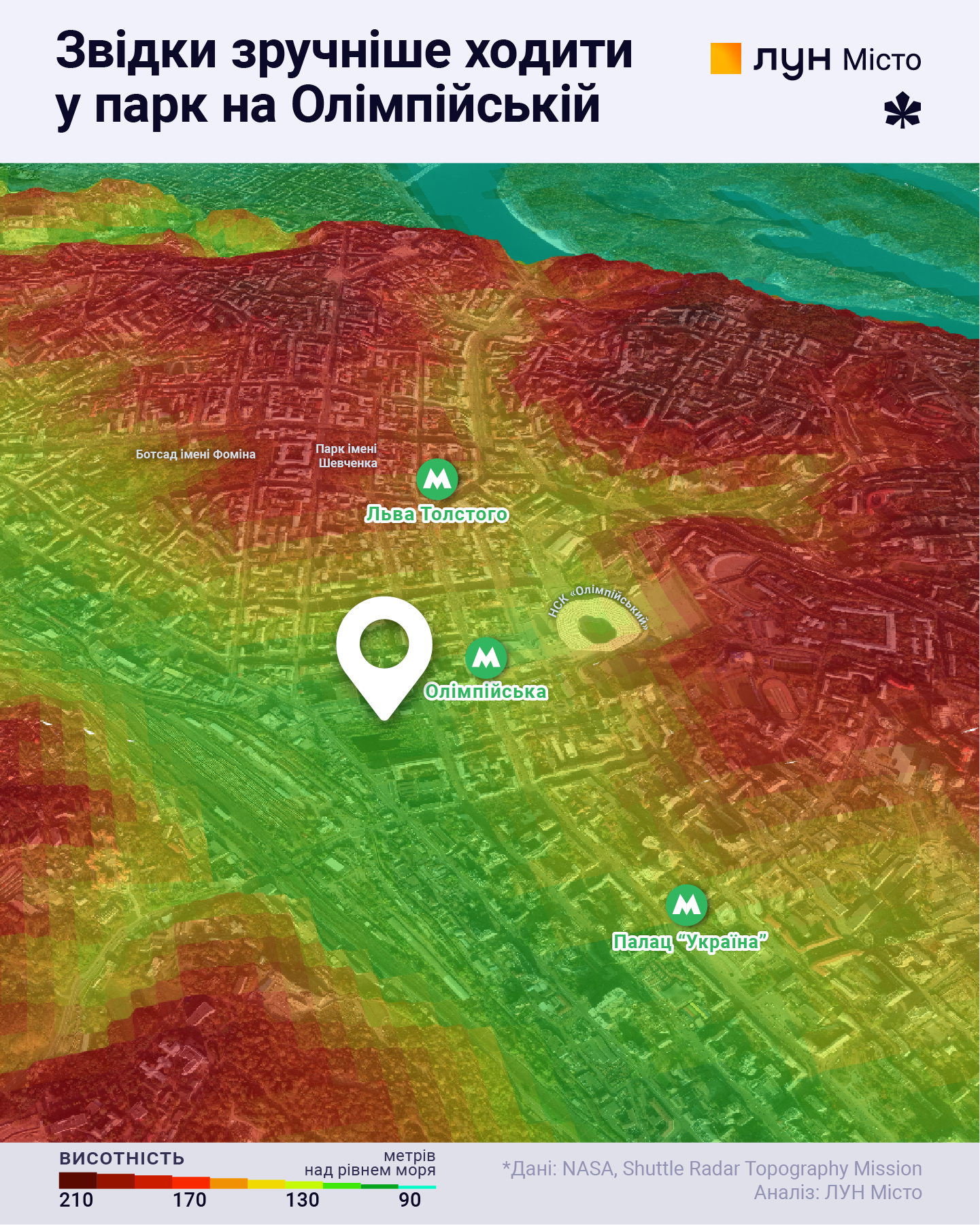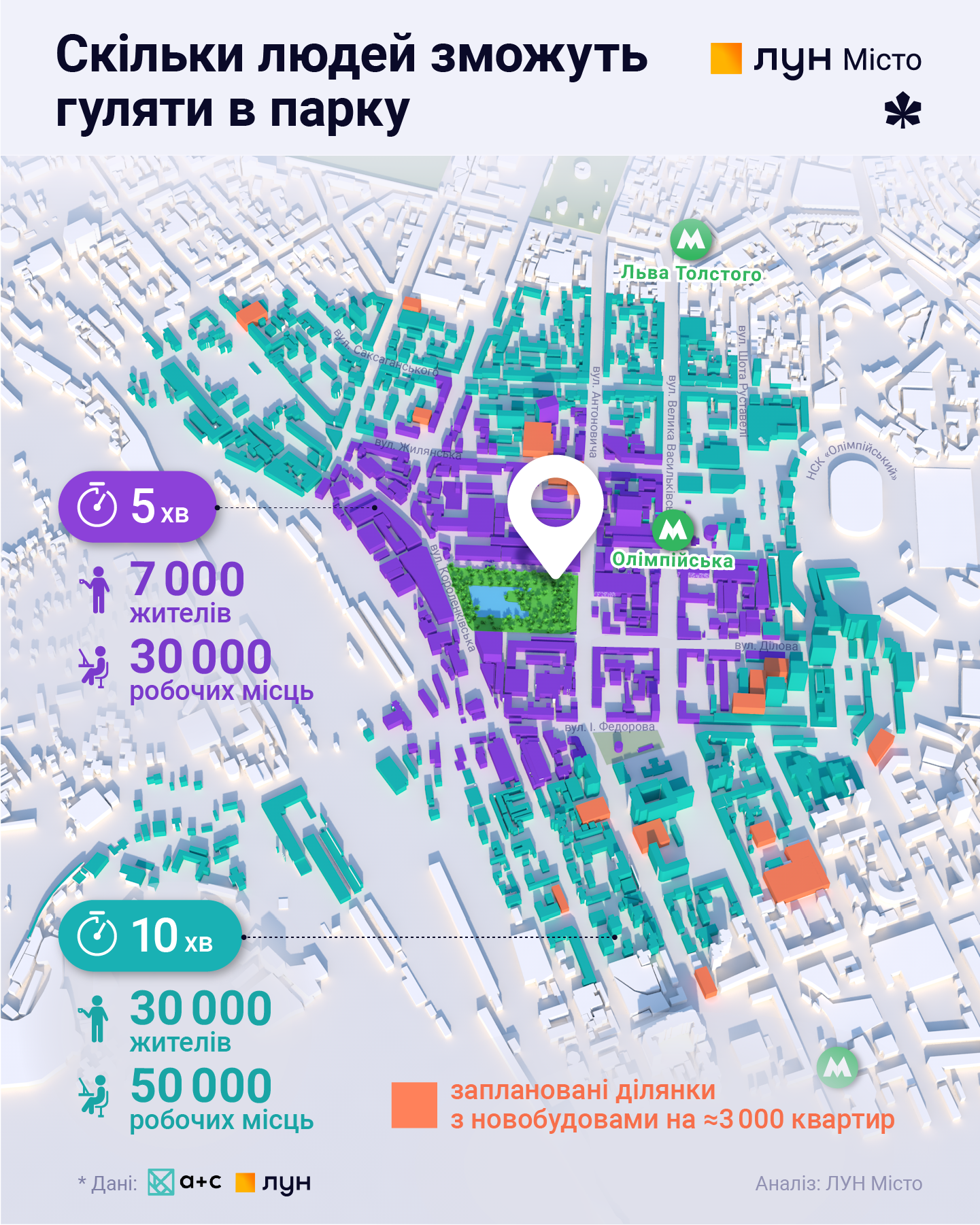 Тож ми провели кілька підрахунків та експериментів. Спочатку проаналізували, що знаходиться у 5- та 10-хвилинній пішохідній доступності до парку. Ця територія майже сягає площі Льва Толстого та трохи не дістає Палацу «Україна». Щоб дізнатися, скільки людей живе та працює на цій території, ми запитали дані у компанії