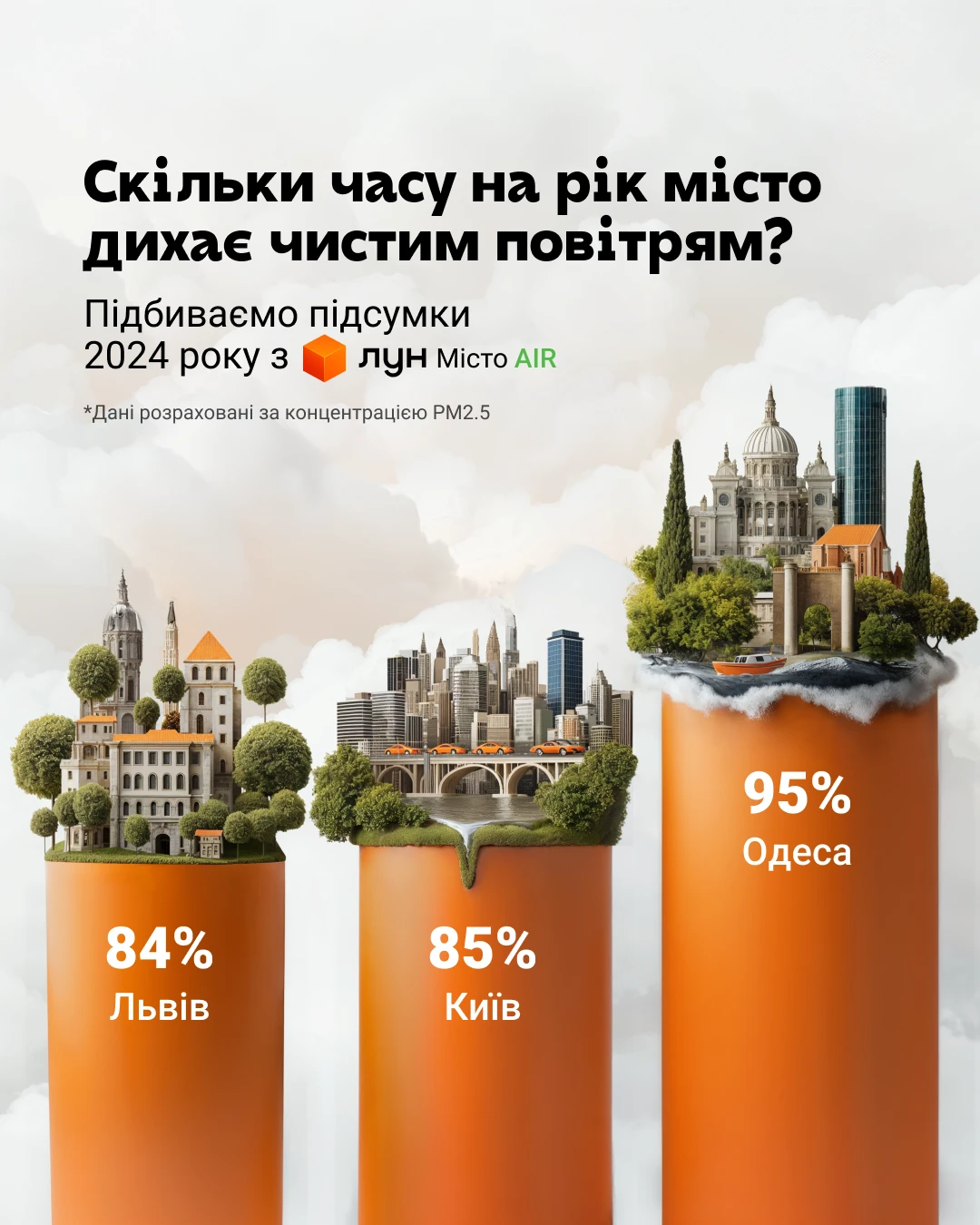 Громадська мережа станцій аналізу якості повітря ЛУН Місто AIR підбила підсумки щодо якості повітря у містах України за 2024 рік.