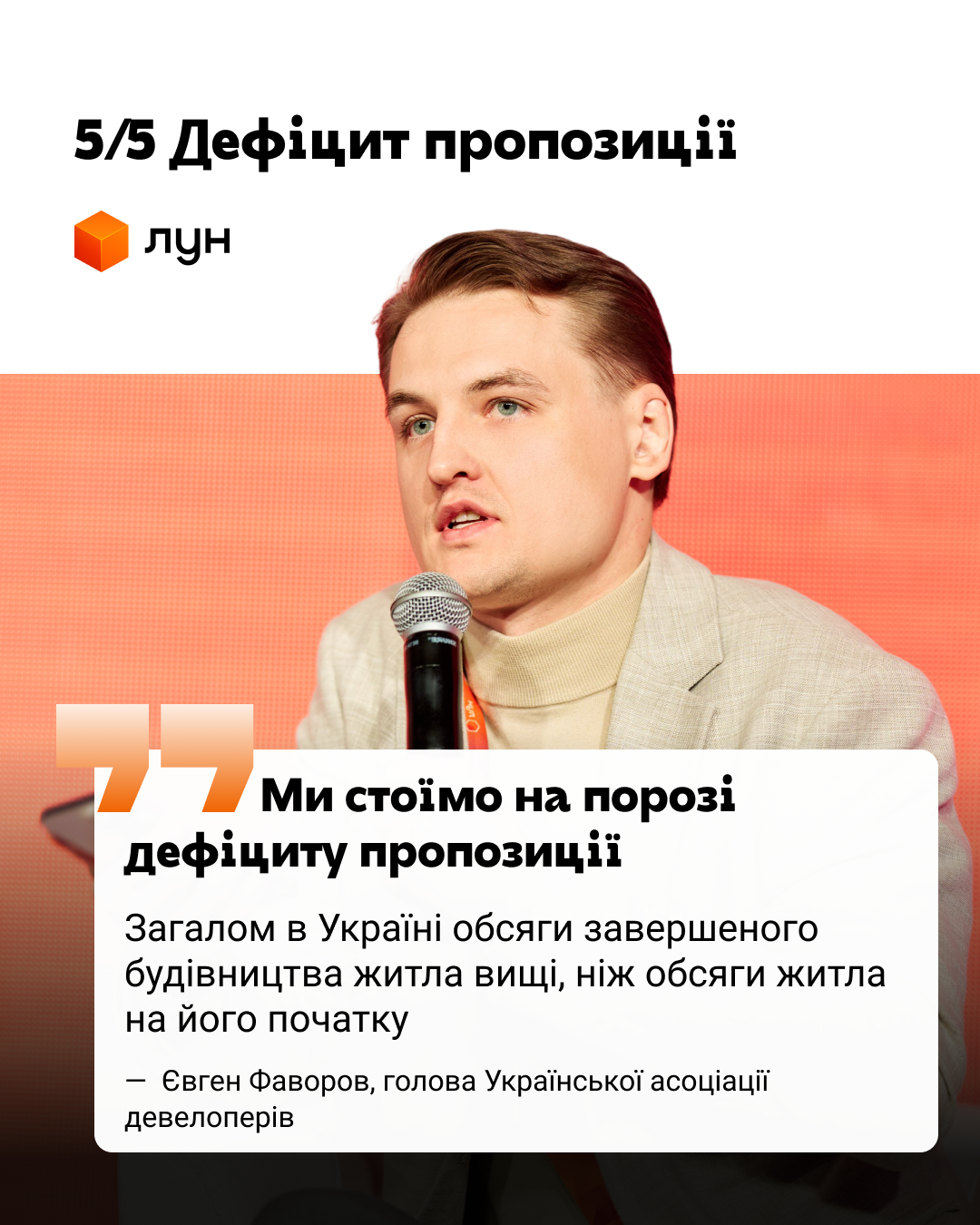 Вірогідність такого сценарію підтвердив і Євген Фаворов, голова Української асоціації девелоперів. Ми стоїмо на порозі дефіциту пропозиції: загалом в Україні обсяги завершеного будівництва житла вищі, ніж обсяги житла на його початку, зазначив він. За словами експерта, серйозного дефіциту та, відповідно, відчутного підвищення цін, можна очікувати в Києві. А от у Львові з балансом початку та завершення будівництва ситуація трохи легша, тому тут «дефіцит не повинен настільки сильно тиснути на ціни», вважає пан Євген.