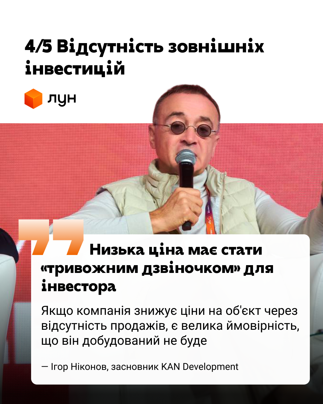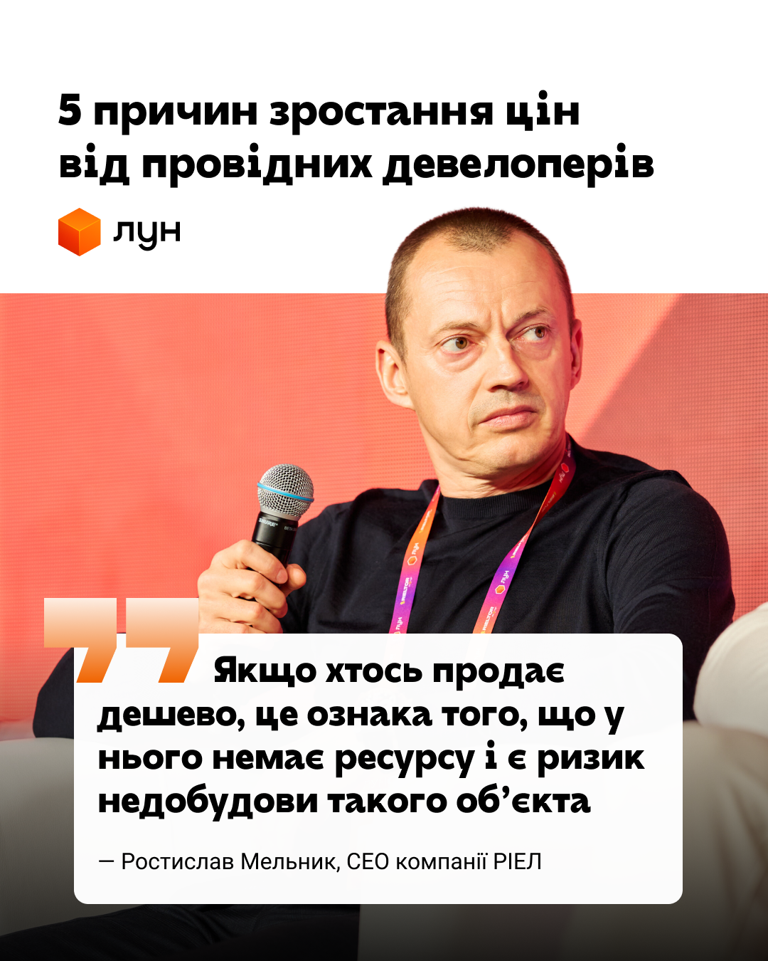 Ростислав Мельник (СЕО компанії РІЕЛ) підтримав позицію колеги та погодився, що занадто низька ціна - це сигнал про ризик. «Якщо хтось продає дешево, це ознака того, що у нього немає ресурсу і є ризик недобудови такого об'єкта».