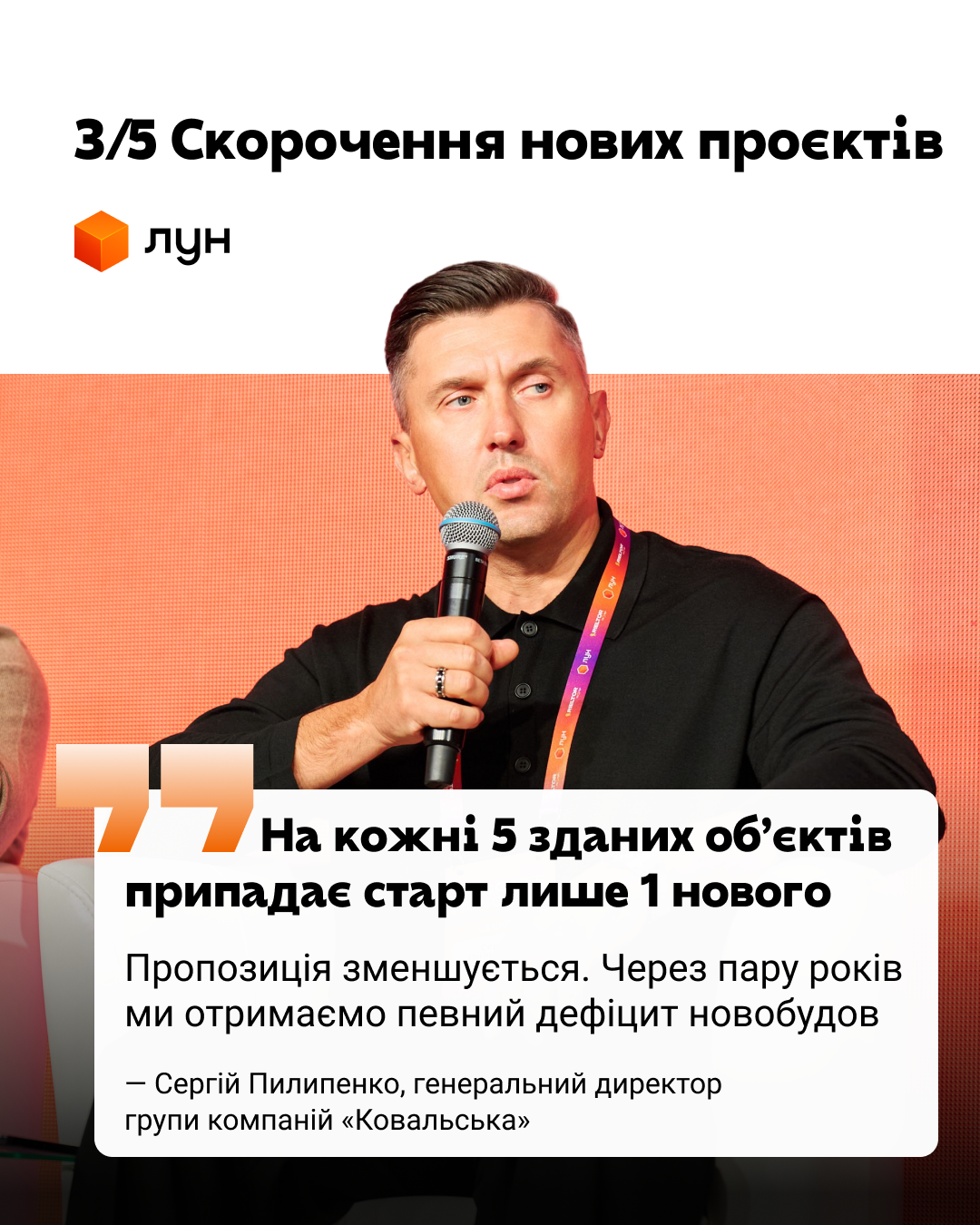 Сергій Пилипенко (генеральний директор група компаній «Ковальська») підкреслив, що останні 3 роки більшість забудовників були зосереджені на тому, аби добудувати ті проєкти, які були розпочаті до повномасштабного вторгнення. «На кожні 5 зданих об’єктів припадає старт лише 1 нового, - зауважив пан Сергій. - Пропозиція зменшується. Через пару років ми отримаємо певний дефіцит новобудов, який, в комплексі з підвищенням собівартості, штовхатиме ціни вгору».