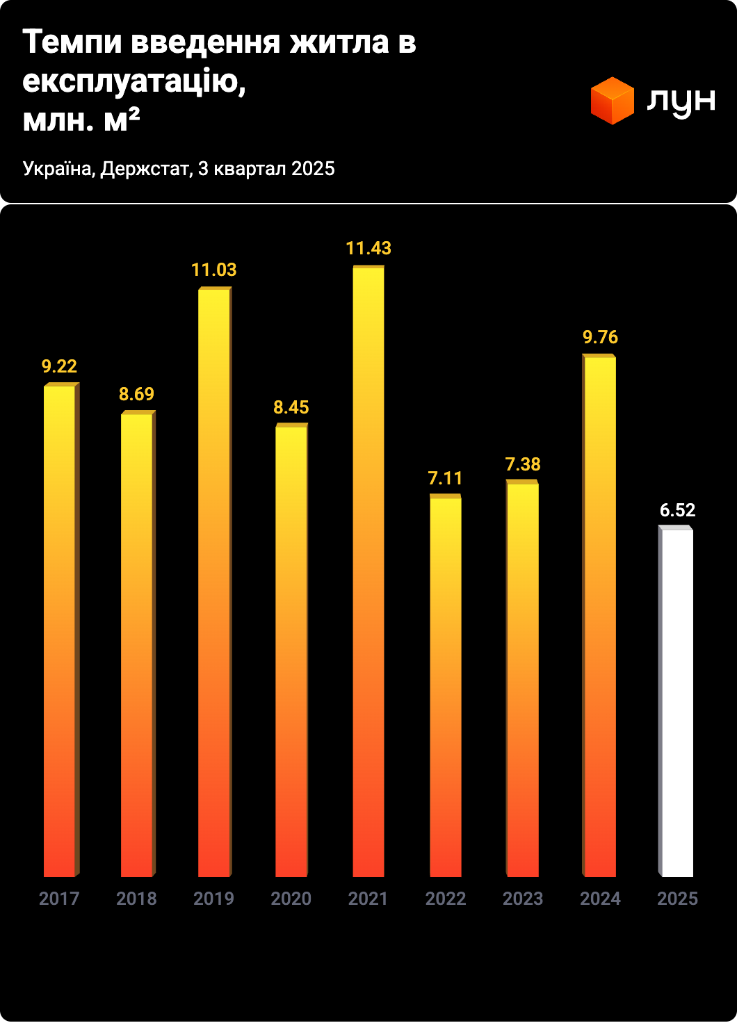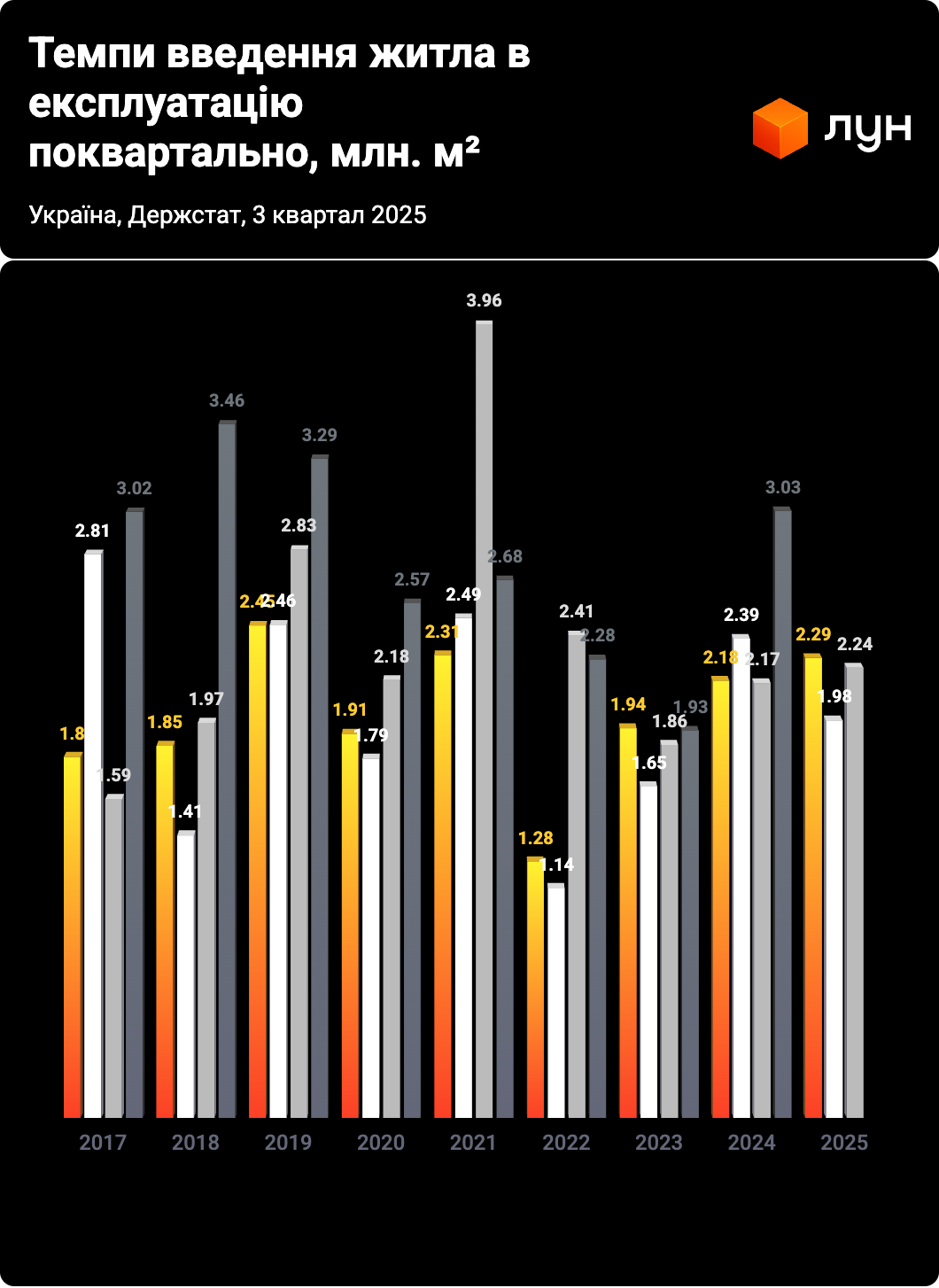 Попри всі виклики, український ринок первинки живе та працює. Хоча за даними Держстату, за 9 місяців поточного року кількість зданого в експлуатацію житла не набагато, але все ж таки знизилась у порівнянні з аналогічним періодом 2024 року. Це може пояснюватись меншими обсягами початку будівництва після повномасштабного вторгнення. Загалом в країні за три квартали поточного року ввели в експлуатацію 6,52 млн кв. м житла. Найбільше - в Київській області, житловий фонд якої від початку року збільшився на 1,37 млн кв.м. В столиці за цей же період було здано в експлуатацію 0,76 млн кв.м.Тобто будівельники столичного регіону забезпечили майже третину (32,7%) зданого цьогоріч житла.