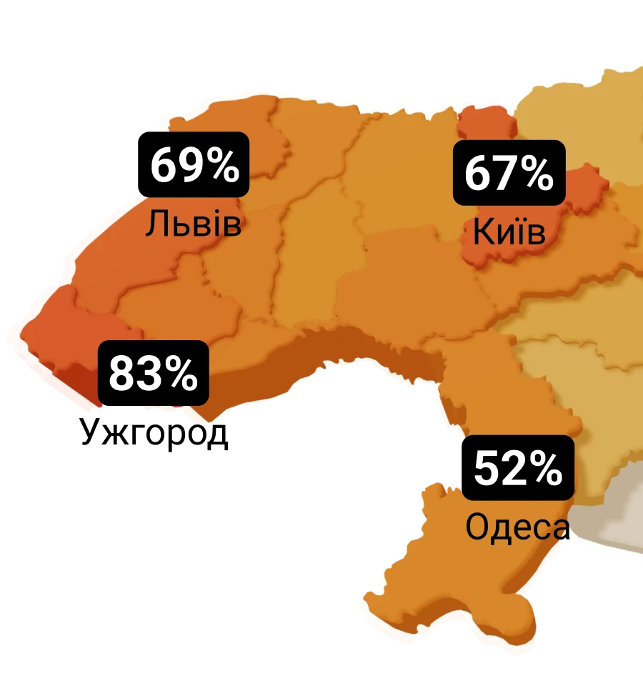 Найменше - у прифронтових регіонах: Херсонській (13,8%), Запорізькій (15,1%), Миколаївській (16,7%) та Харківській (18%) областях. Найбільше - у Закарпатській (53,6%), Чернівецькій (46,8%), Львівській (45,6%), Рівненській та Хмельницькій (45,2%), а також в Івано-Франківській (40,8%) областях. Цікаво, що за даними статистичного відомства в столиці співвідношення орендної плати за 1-кімнатну квартиру та середнього заробітку становить 24,1% - тобто на оренду такої квартири йде менше чверті середньої зарплати по місту.