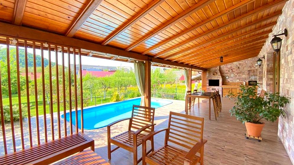 Котедж побудований з натуральних та якісних матеріалів, у стилі австрійського шале. На ділянці 10 соток є місце для паркування трьох автомобілів, басейн, доглянутий сад молодих плодових дерев, озеро. Встановлено систему сигналізації та відеоспостереження. Територія огороджена, є автоматичні ворота. Також на території є гостьовий літній будинок, альтанка, мангал.