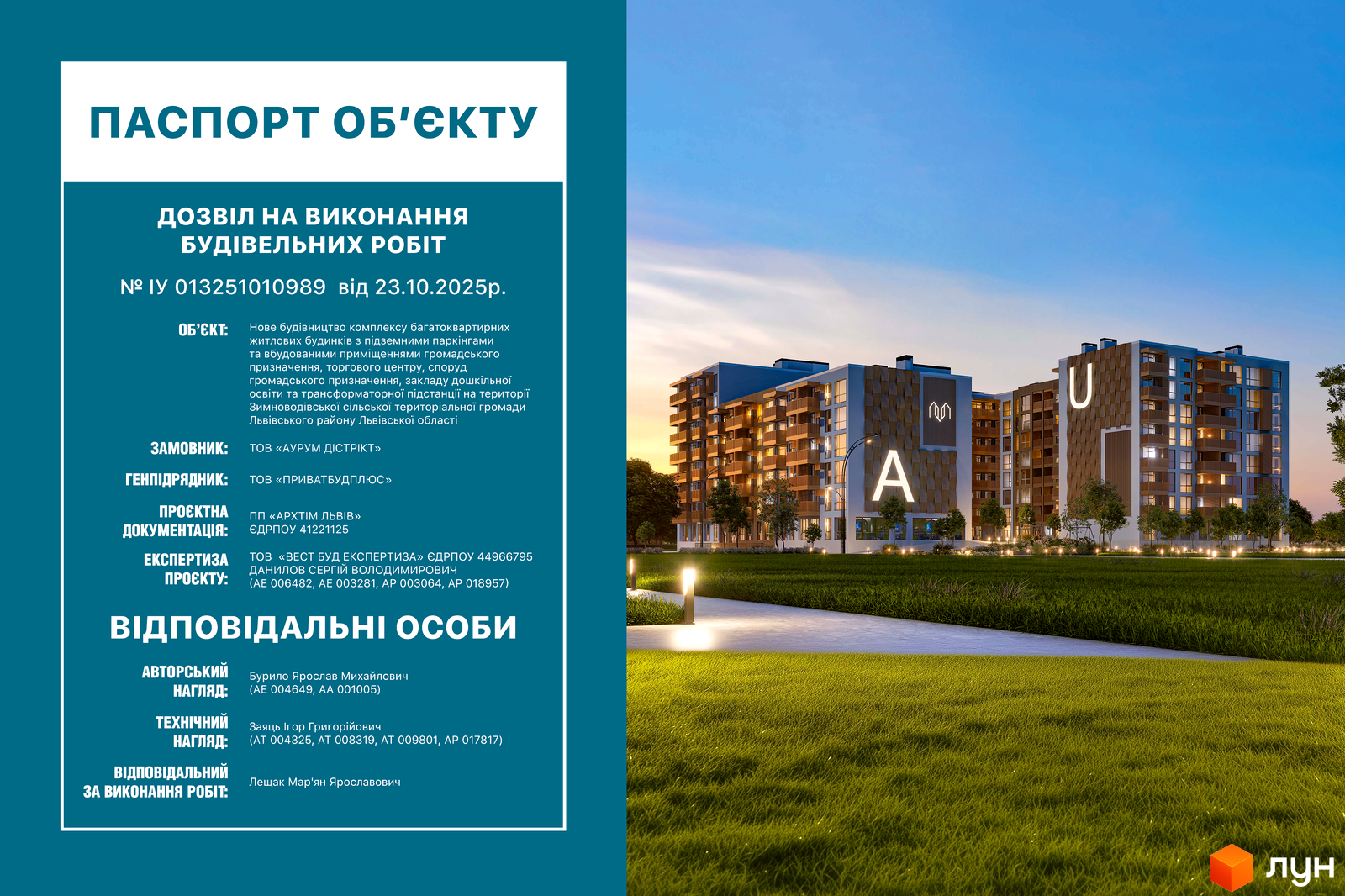 Разрешение на выполнение строительных работ ІУ013251010989 от 23.10.2025 года (Новое строительство комплекса многоквартирных жилых домов с подземными паркингами и встроенными помещениями общественного назначения, торгового центра, сооружений общественного назначения, дошкольного образования и трансформаторной подстанции)