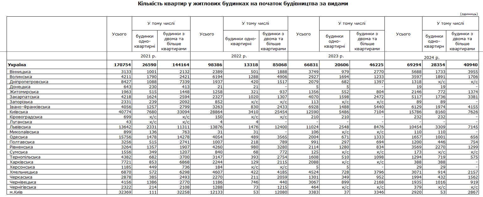 Також зауважимо, що в Івано-Франківській, Закарпатській, Вінницькій та Рівненській областях в 2024 році почали будувати навіть більше квартир, ніж в 2021 році.