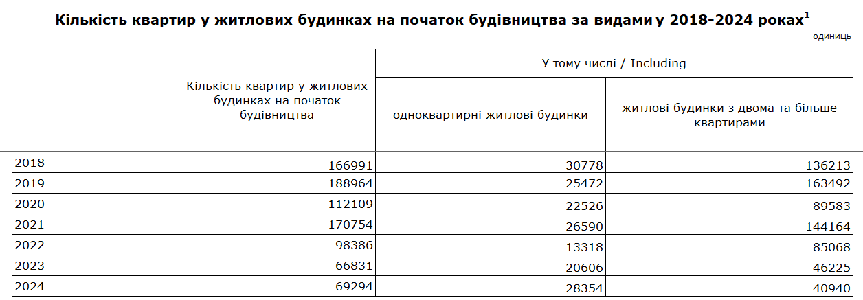 Згідно з даними Держстату, минулого року в Україні почали будувати 69294 квартири. Це трохи більше, ніж обсяги початку будівництва в 2023 році, але суттєво менше за показники перед повномасштабним вторгненням. Згідно з статистичними даними, в 2024 році кількість квартир на початок будівництва знизилась майже вдвічі у порівнянні з 2021 роком (170754 квартири). А у порівнянні з 2019 роком - у 2,5 раза (188964 квартири).