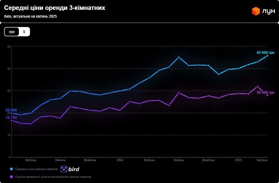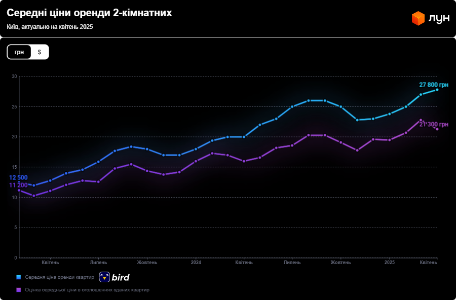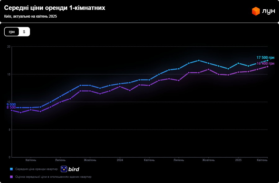 За даними ЛУН, орендні ставки в столиці стрімко йдуть вгору. На початку травня 2025 року орендувати 1-кімнатну квартиру стало дорожче на 3,5 тис. грн, ніж рівно рік тому.