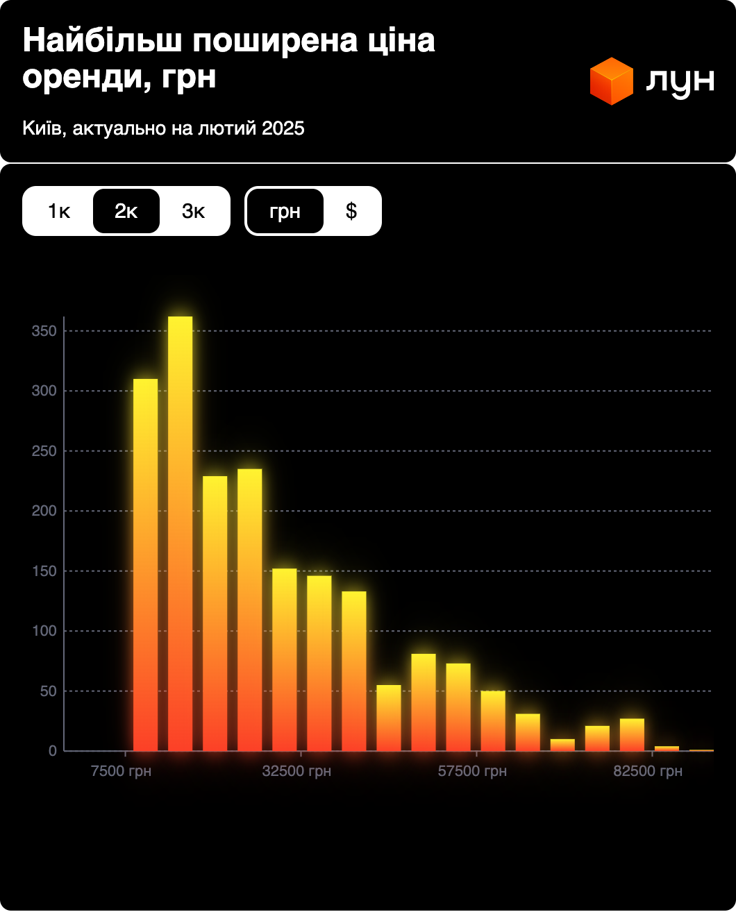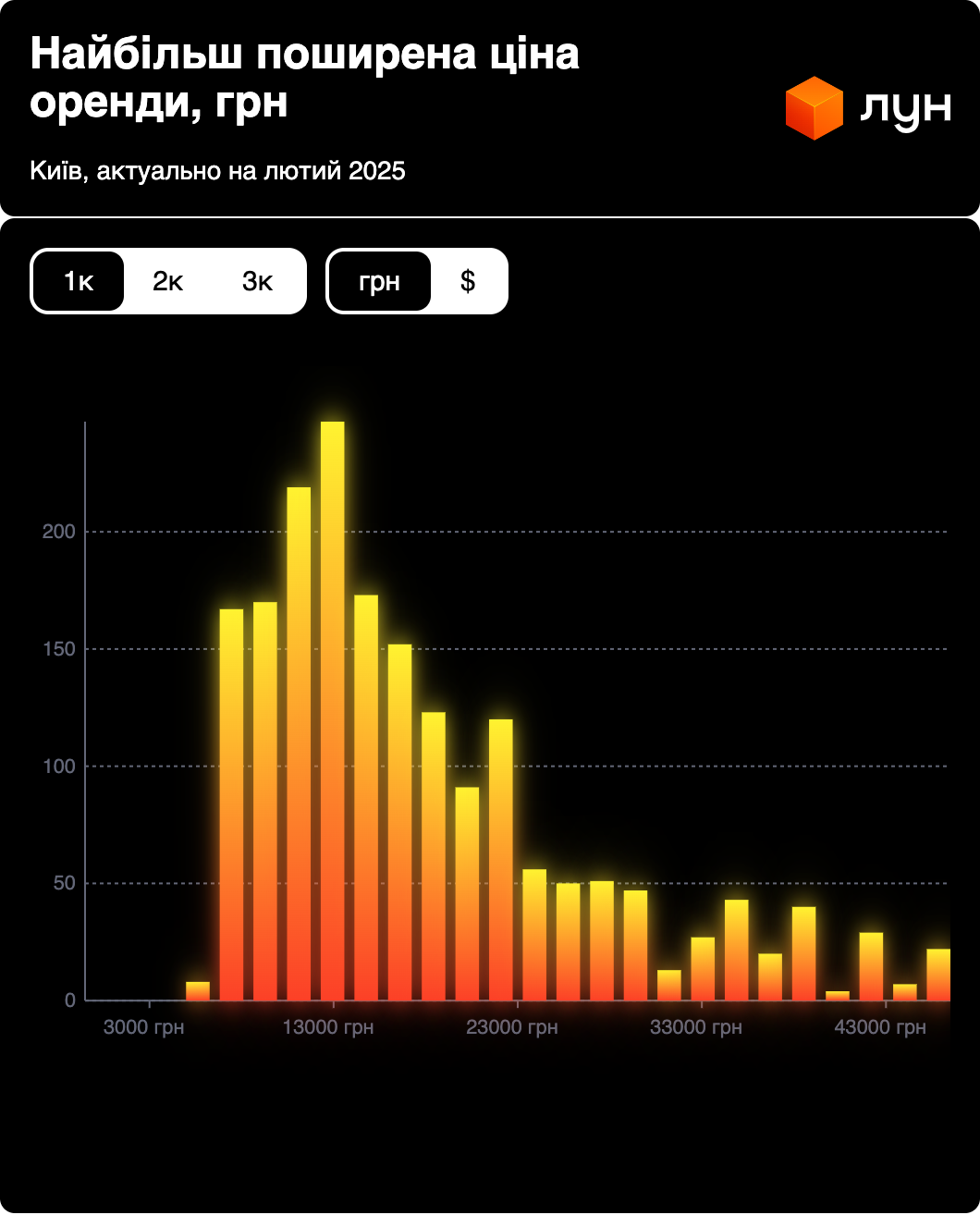 За даними ЛУН Статистика, на початку лютого 2025 року найбільший вибір 1-кімнатних квартир під оренду в Києві знаходиться в бюджеті 12-16 тис. грн., а 2-кімнатних - 15-20 тис. грн.