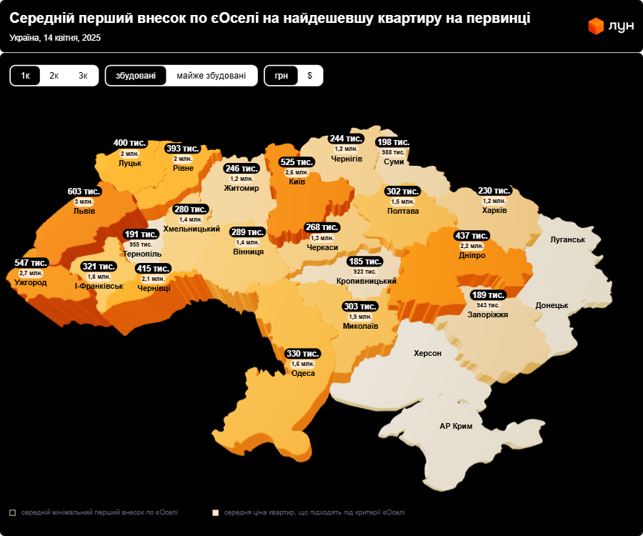 Також в ЛУН підрахували, скільки, в середньому, знадобиться на перший внесок за програмою пільгової іпотеки єОселя в різних містах країни. Наприклад, сума першого внеску за готову 1-кімнатну квартиру від забудовника в Києві, в середньому, становитиме 525 тис. грн, а за аналогічну квартиру, яка ще будується - майже на 100 тис. менше, 420 тис. грн.