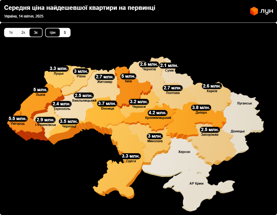Серед 3-кімнатних квартир найвища середня вартість найдешевших квартир на первинці - в Ужгороді, аж 5,5 млн грн. Це навіть більше, ніж у Львові та Києві, де найдешевша 3-кімнатна квартира обійдеться приблизно у 5 млн грн.