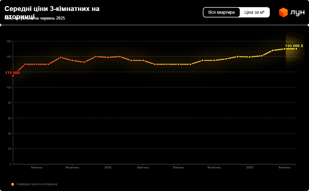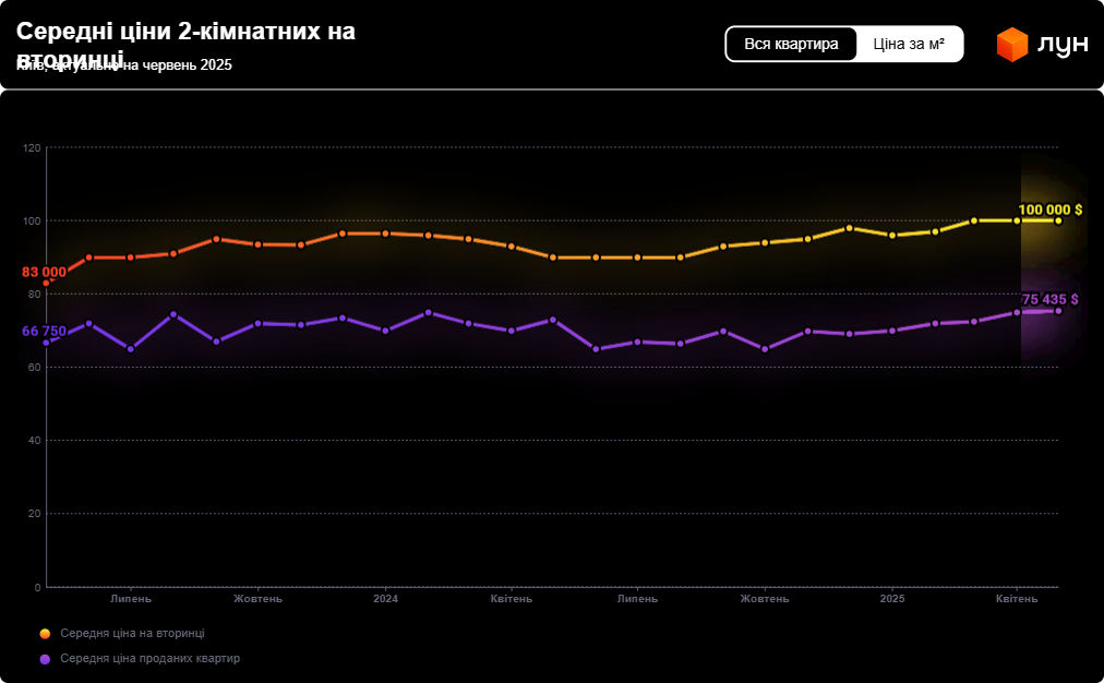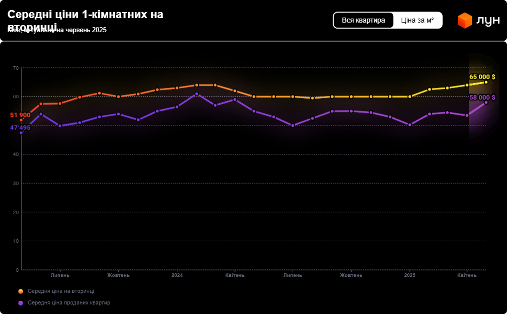 При цьому середні ціни на столичні квартири за той же період демонструють підвищення вартості. Так, за даними ЛУН, в березні 2025 року в Києві середня ціна 1-кімнатних в оголошеннях про продаж становила $63 тис., у квітні - $64 тис., а в травні - $65 тис. А середня вартість проданих 1-кімнатних квартир за цей період зросла з $54,5 тис. до $58 тис.