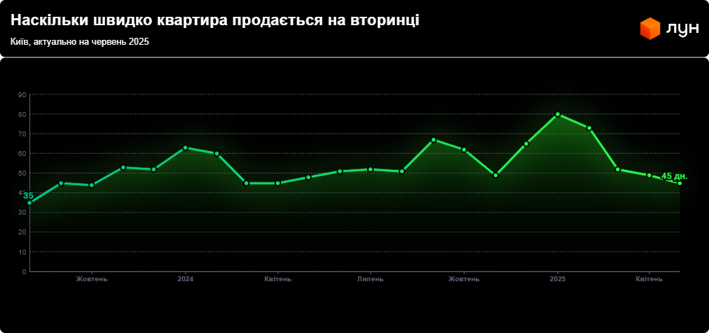 Від початку відновлення повноцінної роботи реєстрів (лютий 2025 року), швидкість продажу квартир на столичній вторинці суттєво скоротилась. Якщо у березні 2025 року середній термін експозиції квартири на ринку становив 52 днів, то у квітні столична квартира, в середньому, продавалась за 49 днів, а у травні - за 45 днів.