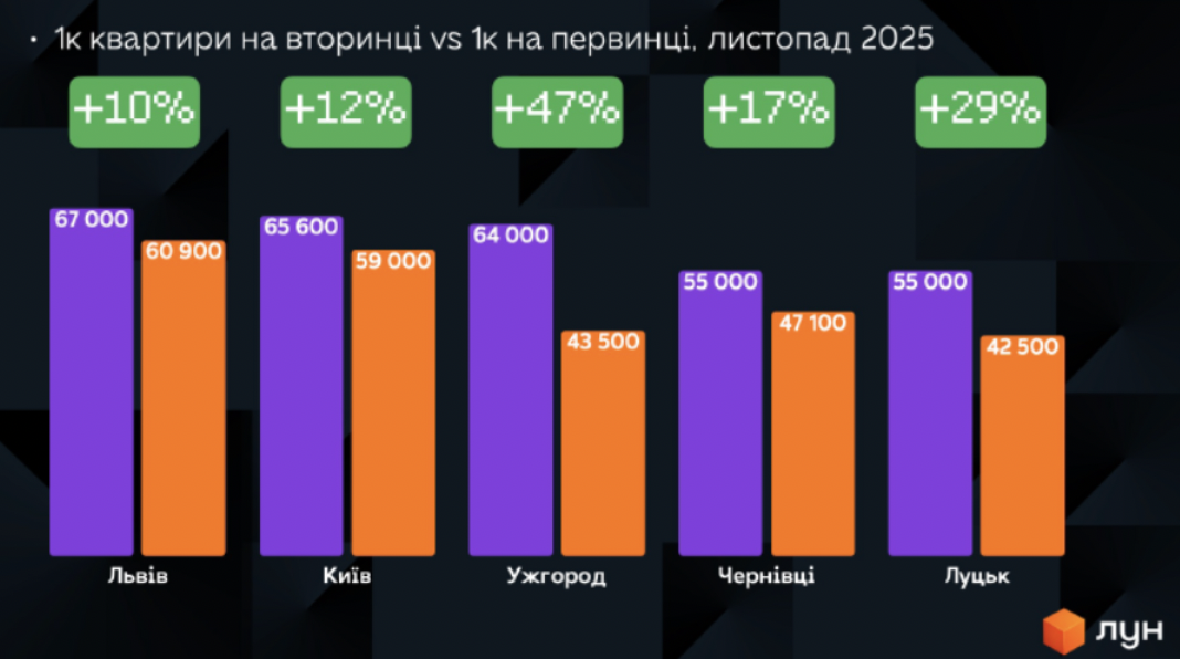 Найвищій розбіг між середніми цінами квартир на вторинці та первинці бачимо в Ужгороді - вторинка дорожча за первинку майже на 50%. На другому місті - Луцьк, де вторинка майже на третину дорожча за первинку. У столиці та Львові різниця між вартістю вторинкою та первинкою становить 10-12%.