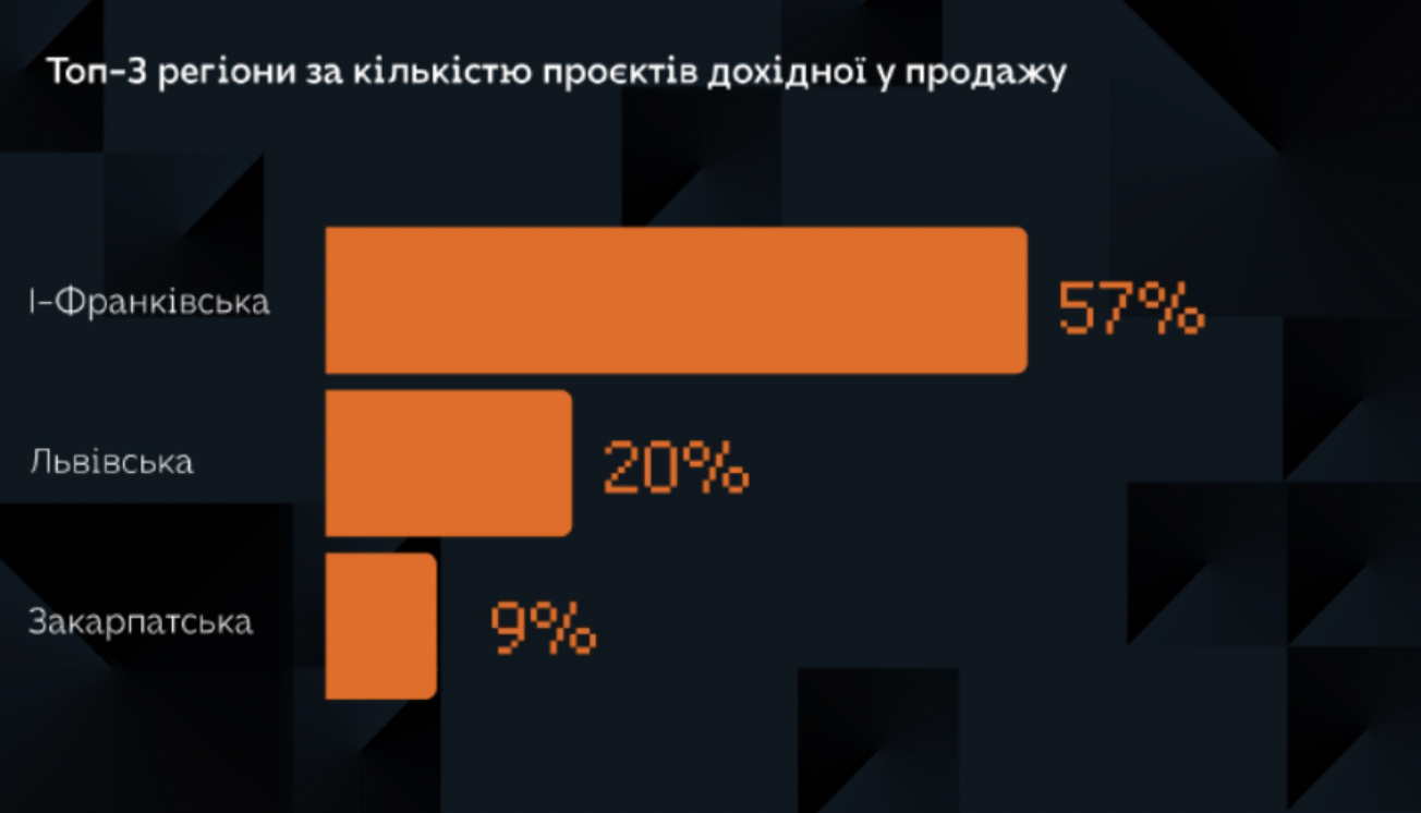 Другою за активністю девелоперів є Львівська область, а за нею майже на одному рівні представлена відчутна кількість новобудов в Одесі, Івано-Франківську та Хмельницькому.