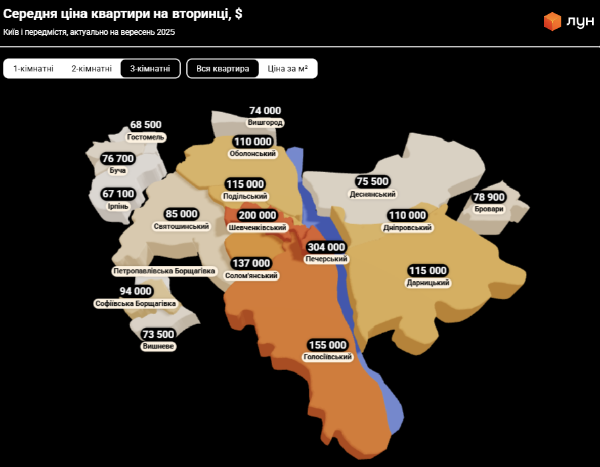 Щодо 3-кімнатних, то після Печерського района найдорожчі квартири також в Шевченківському та Голосіївському районах. 3-кімнатні в них, в середньому, коштують $200 тис. та $155 тис. відповідно.