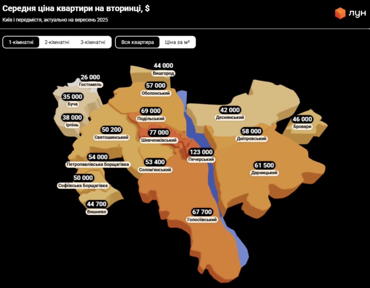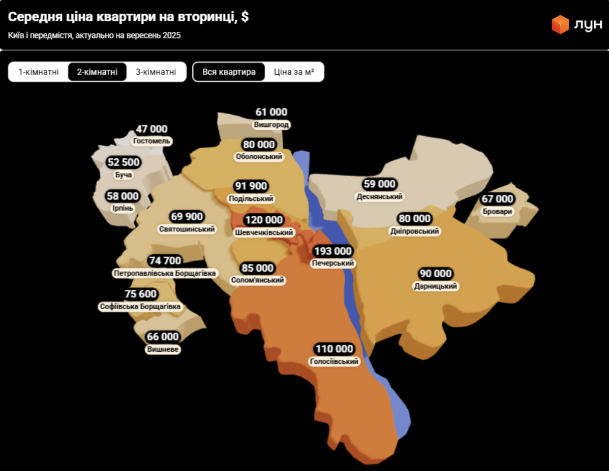 Щодо середніх цін, то найдорожчі квартири на столичній вторинці розташовані в Печерському районі. Якщо загалом по місту середня ціна 1-кімнатних становить $65 тис., 2-кімнатних - $100 тис., а 3-кімнатних - $150 тис., то в Печерському районі середня вартість 1-кімнатних - $123 тис., 2-кімнатних - $193 тис., а 3-кімнатних - $304 тис.