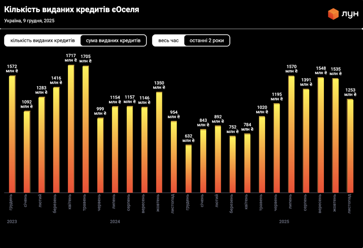 З початку її роботи (кінець 2022 року) було видано понад 21 тис. іпотечних кредитів на суму більше 31 млрд грн. В 2025 році ця програма активно працювала на первинному ринку - зараз в ній акредитовано 114 забудовників та девелоперів, які пропонують житло в 278 будинках на етапі зведення. Тільки в 2025 році саме на готове житло від забудовників та квартири, які ще будуються було оформлено більше 4,3 тис. кредитів - тобто більше половини з майже 7 тис. виданих кредитів загалом.