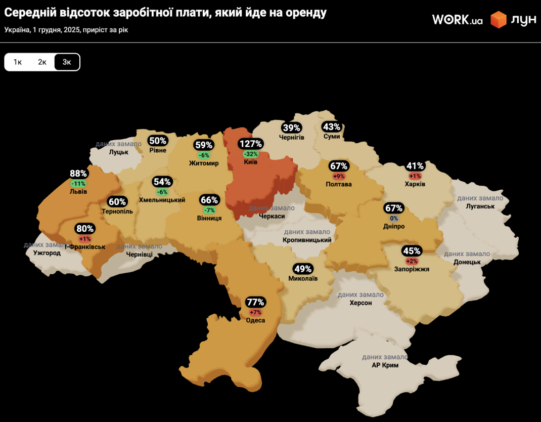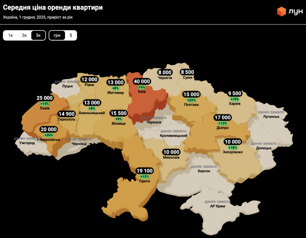 Дещо іншу картину бачимо в сегменті оренди 3-кімнатних квартир. Тут у більшості міст середні ставки за рік не змінились. Але ті міста, в яких зміна все ж таки відбулась, ціна оренди піднялась на відчутний відсоток. Зокрема, на початку грудня 2025 року орендувати 3-кімнатну у Львові на 14% дорожче ніж рік тому, в Одесі - на 15%, в Івано-Франківську - на 20%, в Полтаві - на 25%.