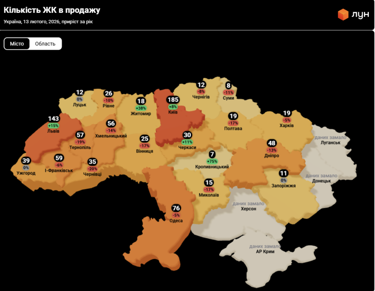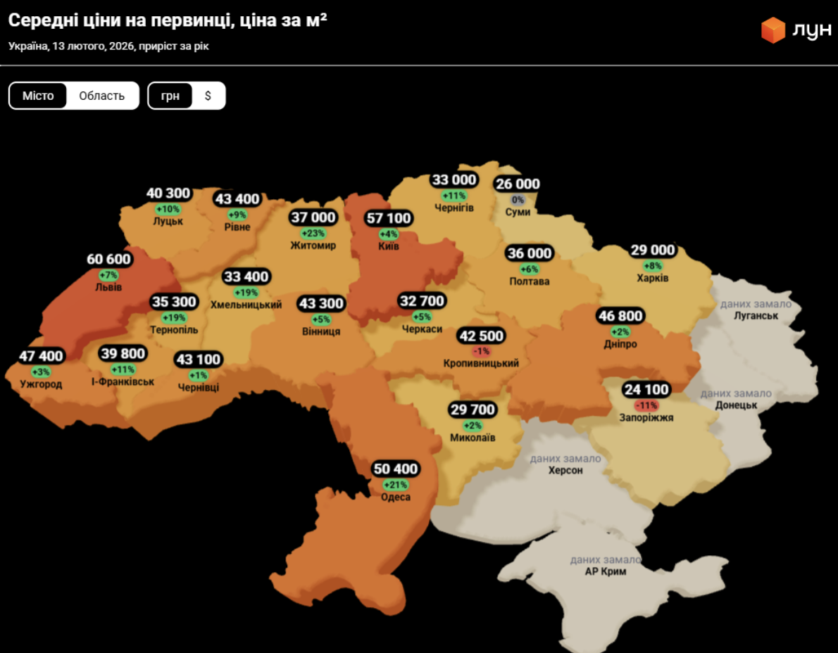 З іншого боку, найнижча вартість квадратного метру на первинці - у східних містах. Зокрема, у Запоріжжі середній квадрат за рік втратив 11% середньої вартості, зараз він коштує лише 24,1 тис. грн. У Сумах квадратний метр новобудов можна купити, в середньому за 26 тис. грн - при цьому така ж його ціна була рік тому, у лютому 2025 року. В Харкові за рік середній квадрат на первинці додав 8%, проте навіть зараз він коштує 29 тис. грн. Це навіть дешевше, ніж в Миколаєві, де за рік забудовники підняли ціни на 2%, тож квадратний метр тут, в середньому, коштує 29,7 тис. грн.