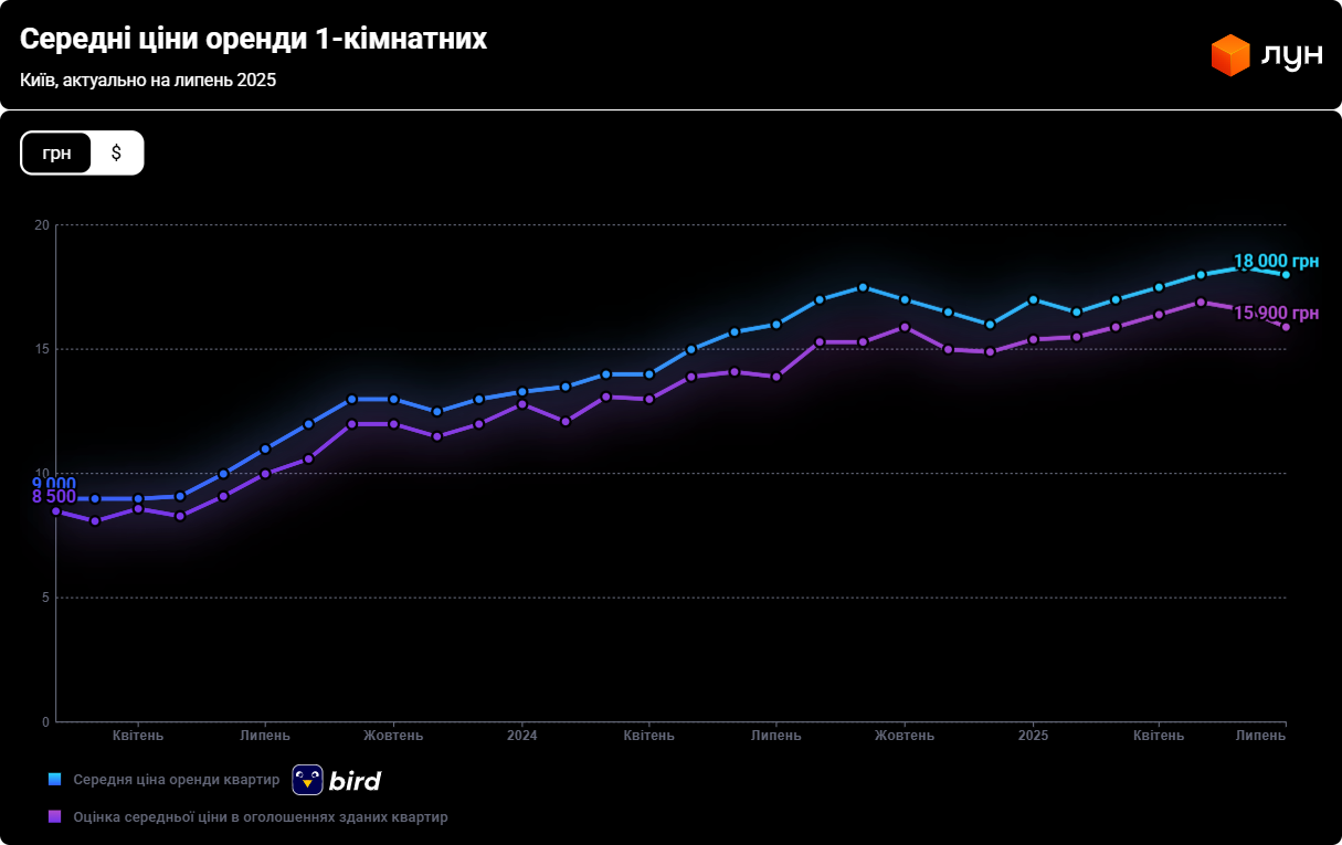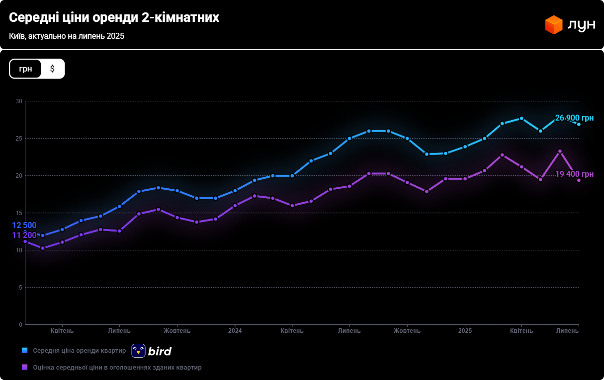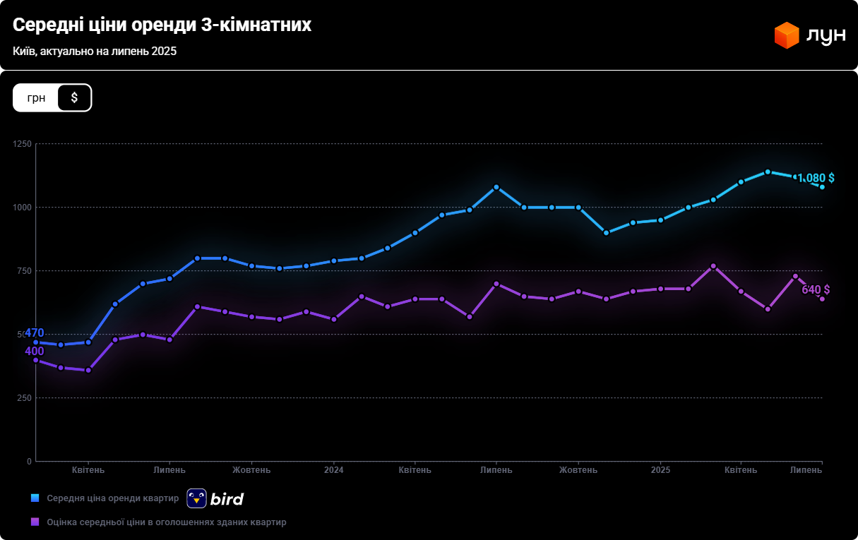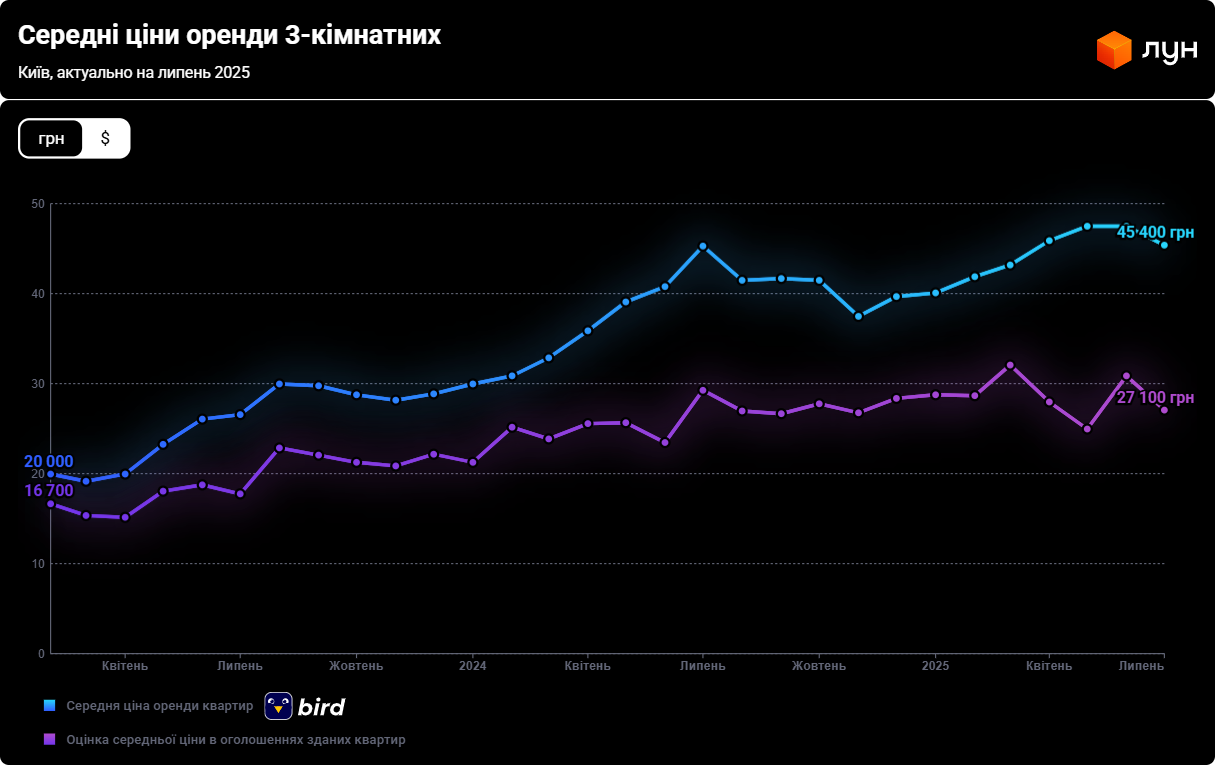 Наприклад, для 1-кімнатних квартир середня ціна зданих квартир становила майже 16 тис. грн, що на 2 тис. грн нижче за середню ціну в оголошеннях про оренду. Для 2-кімнатних середня ціна зданих квартир становить 19,4 тис. грн, що на 7,5 тис. грн нижче за ціну в оголошеннях. А 3-кімнатні в липні здавались за 27,1 тис. грн, що майже на 19 (!) тисяч нижче за «середню ціну від орендодавців».