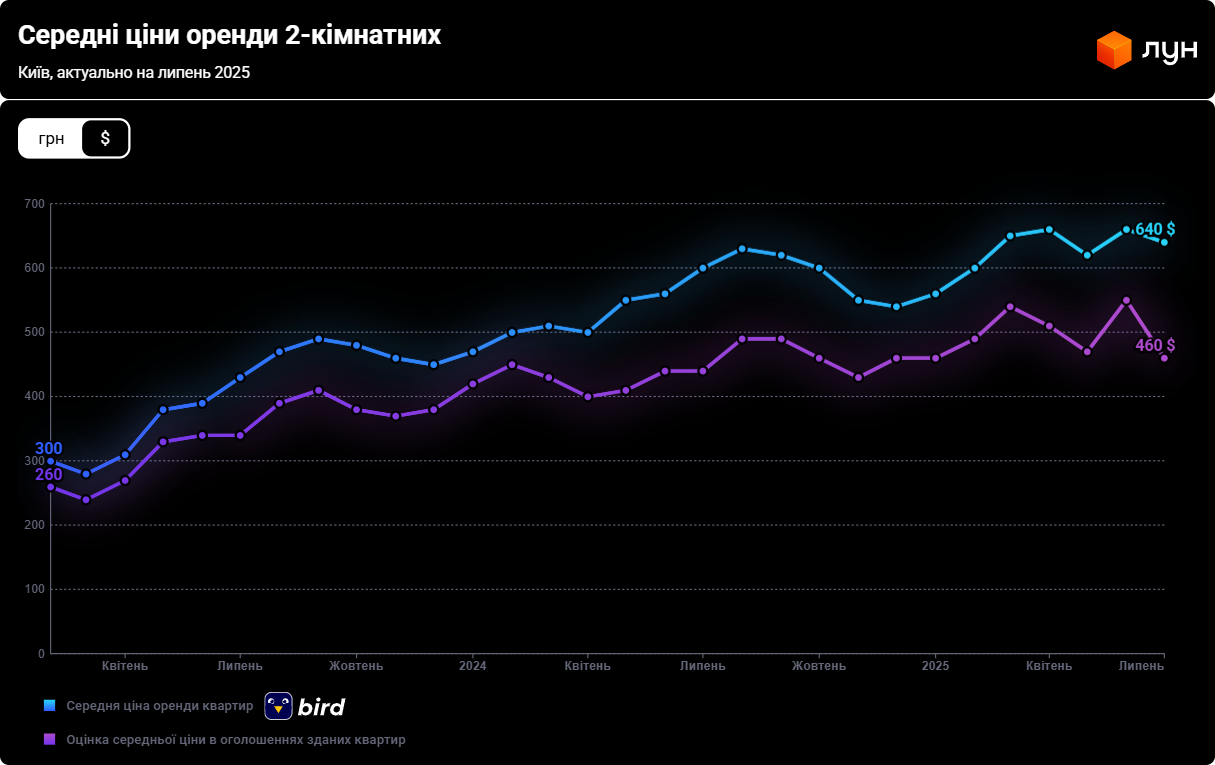 А ось середні ціни на оренду дво- та трикімнатних за місяць знизились навіть в доларах. Зокрема «двушки» подешевшали на $20 доларів, з $660 до $640 на місяць, а «трьошки» - на $50, з $1130 до $1080.