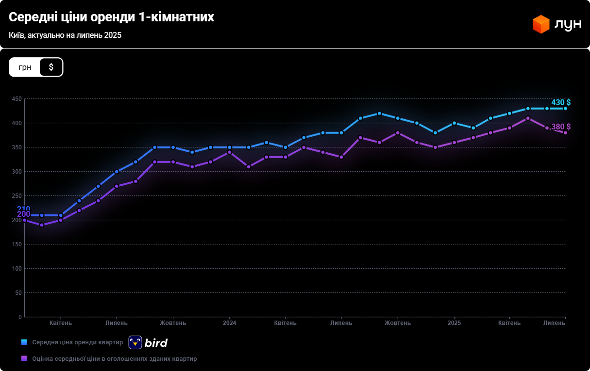 Середня вартість оренди 1-кімнатної квартири в столиці тримається на рівні $430
