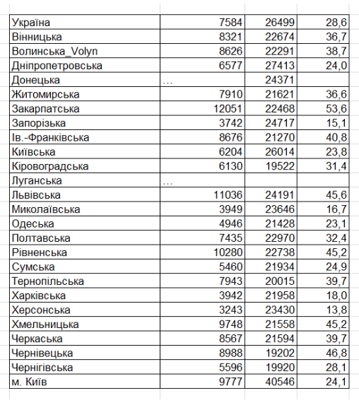 Найменше - у прифронтових регіонах: Херсонській (13,8%), Запорізькій (15,1%), Миколаївській (16,7%) та Харківській (18%) областях. Найбільше - у Закарпатській (53,6%), Чернівецькій (46,8%), Львівській (45,6%), Рівненській та Хмельницькій (45,2%), а також в Івано-Франківській (40,8%) областях. Цікаво, що за даними статистичного відомства в столиці співвідношення орендної плати за 1-кімнатну квартиру та середнього заробітку становить 24,1% - тобто на оренду такої квартири йде менше чверті середньої зарплати по місту.