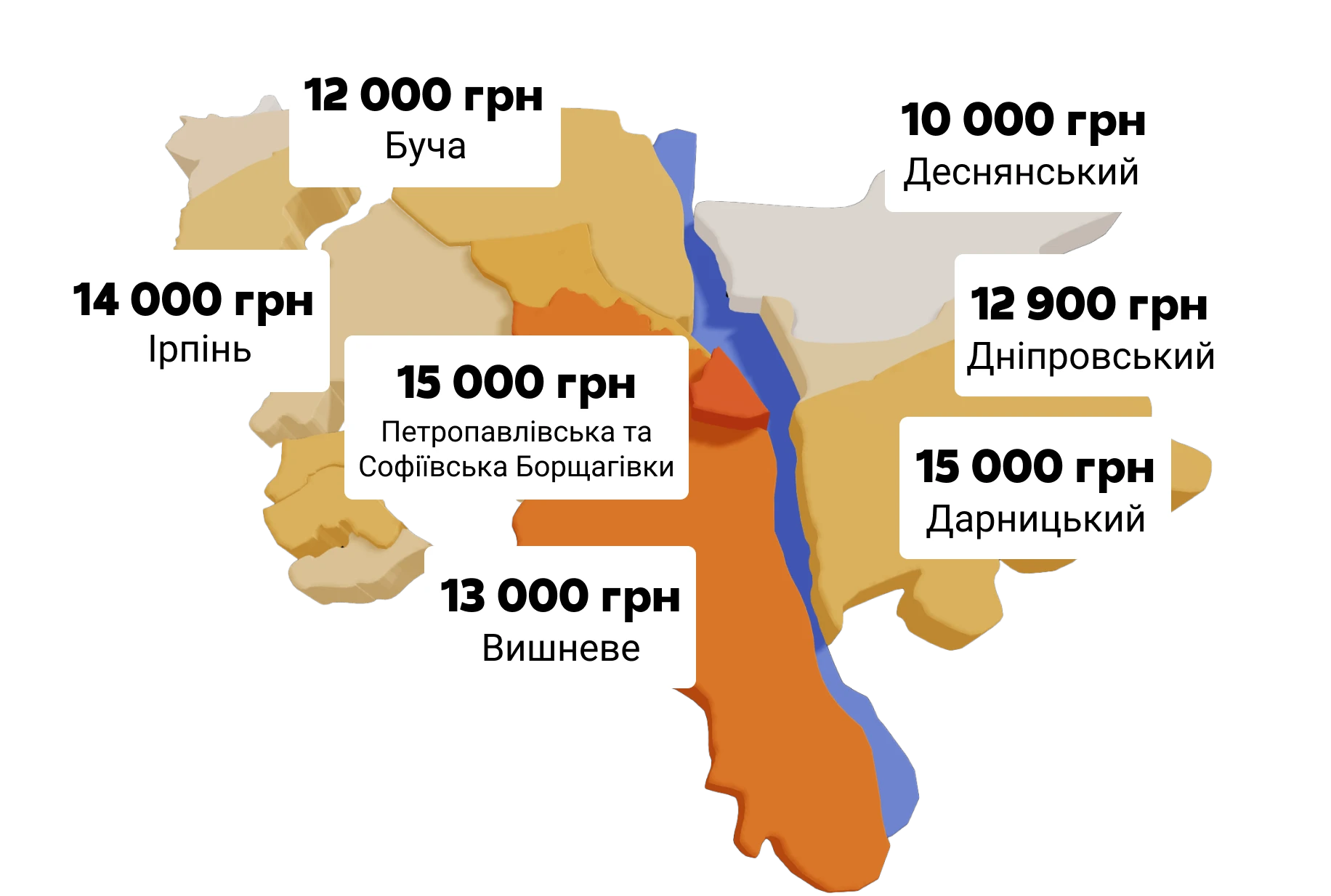 Найбільш доступним передмістям була Буча, де середня вартість оренди 1-кімнатної становила 12 тис. грн. А найдорожчою виявилась Софіївська Борщагівка, де таку квартиру пропонували, в середньому, за 15 тис. грн. До речі, це навіть вище за середню вартість оренди 1-кімнатної в Дніпровському та Святошинському районах столиці - в них оренда 1-кімнатної коштувала 12,9 тис. грн та 13 тис. грн відповідно. Цікаво, що як і в Софіївській Борщагівці, ті ж середні 15 тис. грн коштувала оренда 1-кімнатної в Оболонському та Дарницькому районах столиці.