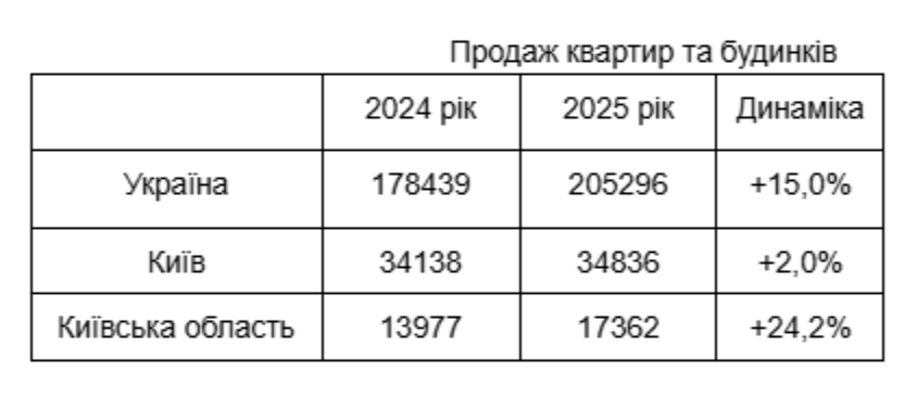 Зокрема в 2025 році в Києві купили 34,8 тис. квартир, а в Київській області - 17,4 тис. що відповідно на 2% та 24% більше, ніж в 2024 році.