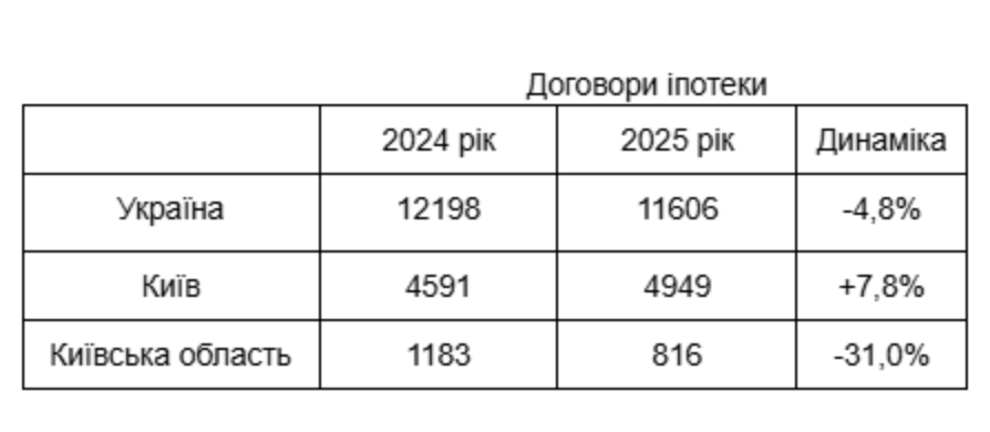 За даними Мін'юсту, загальна кількість посвідчених нотаріусами іпотек знизилась з 12198 договорів в 2024 році до 11606 угод в 2025 (-5%). Проте в столиці бачимо протилежну тенденцію: кількість іпотечних договорів, укладених щодо столичного житла збільшилась майже на 8%, з 4591 угод в 2024 до 4949 в 2025.