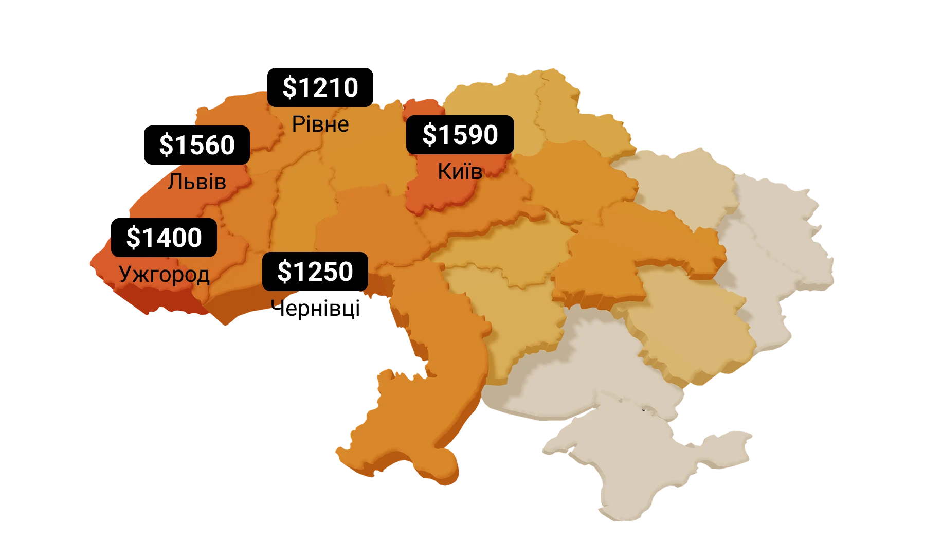 Замикає п'ятірку найдорожчих міст Рівне, де 1 квадратний метр 1-кімнатної квартири коштує, в середньому, $1210. За 6 місяців зростання його вартості становило трохи більше 5%, а за 12 місяців - більше 12%.