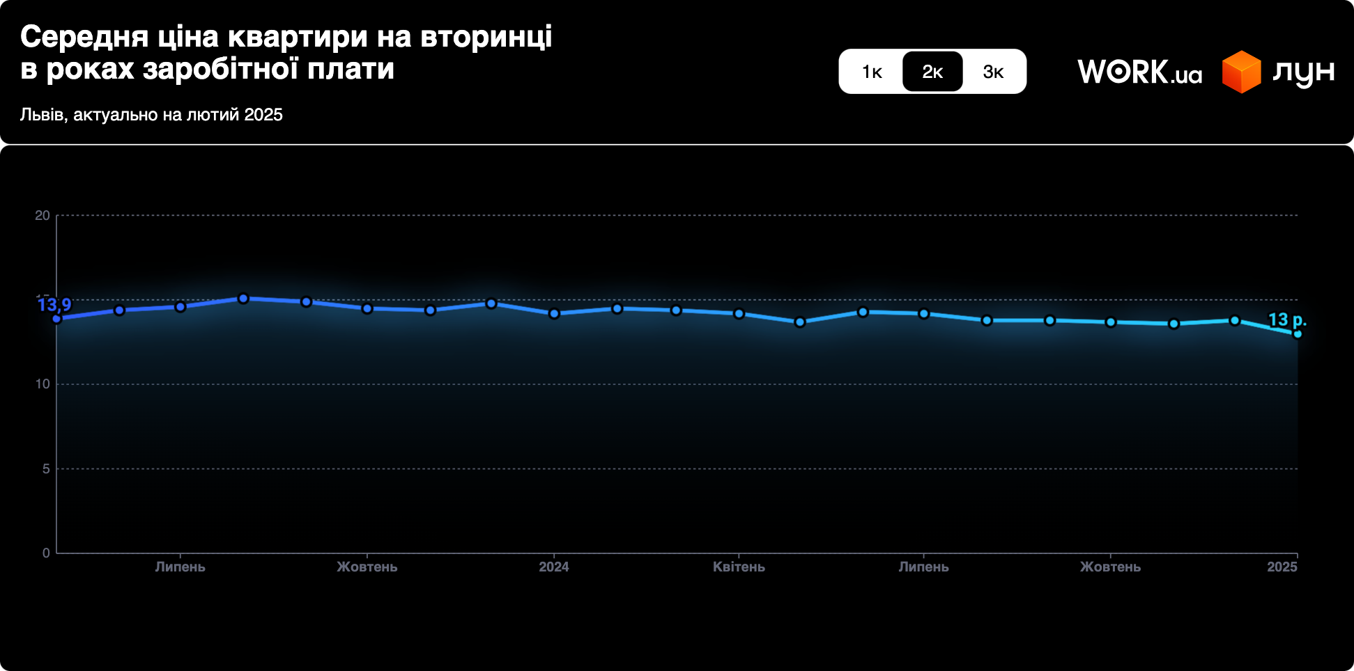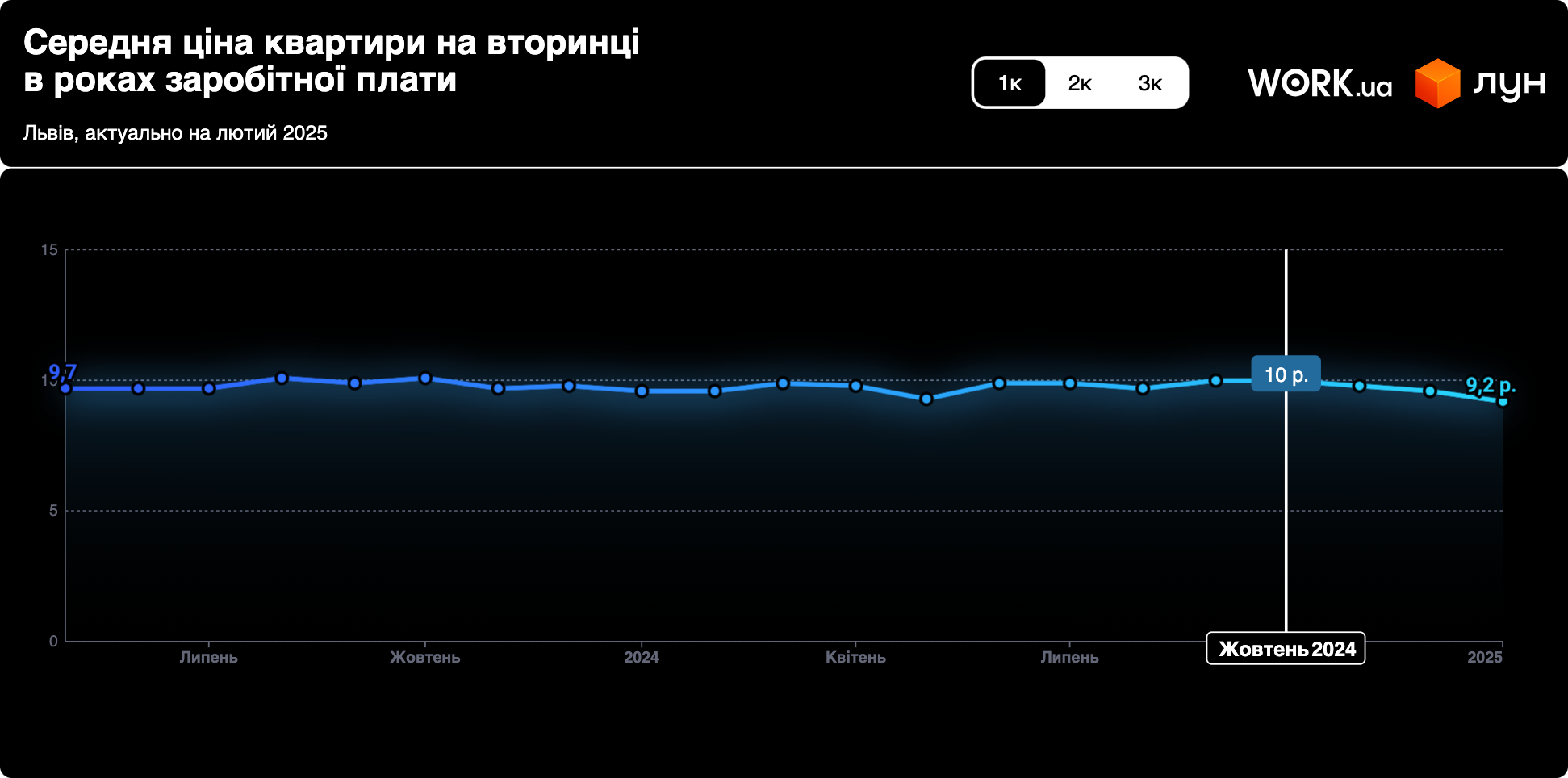 Що стосується Львова, то в лютому 2025 року на купівлю 1-кімнатної квартири доведеться витратити, в середньому, 9,2 місцевих річних зарплати, на купівлю 2-кімнатної - заробіток за 13 років, а на купівлю 3-кімнатної - за 16,6 років. Як і в столиці, деякий спад співвідношення середньої вартості квартири до середньої зарплати було зафіксоване у травні 2024 року. Але якщо в Києві на початку минулорічного періоду блекаутів вартість квартири в кількості середніх зарплат впала до історичного мінімуму, то у Львові вона була трохи вищою, ніж зараз. Зокрема, в травні минулого року вартість 1-кімнатної коштувала суму заробітку за 9,3 роки, 2-кімнатна - за 13,7 років, а 3-кімнатна - за 16,7 років.